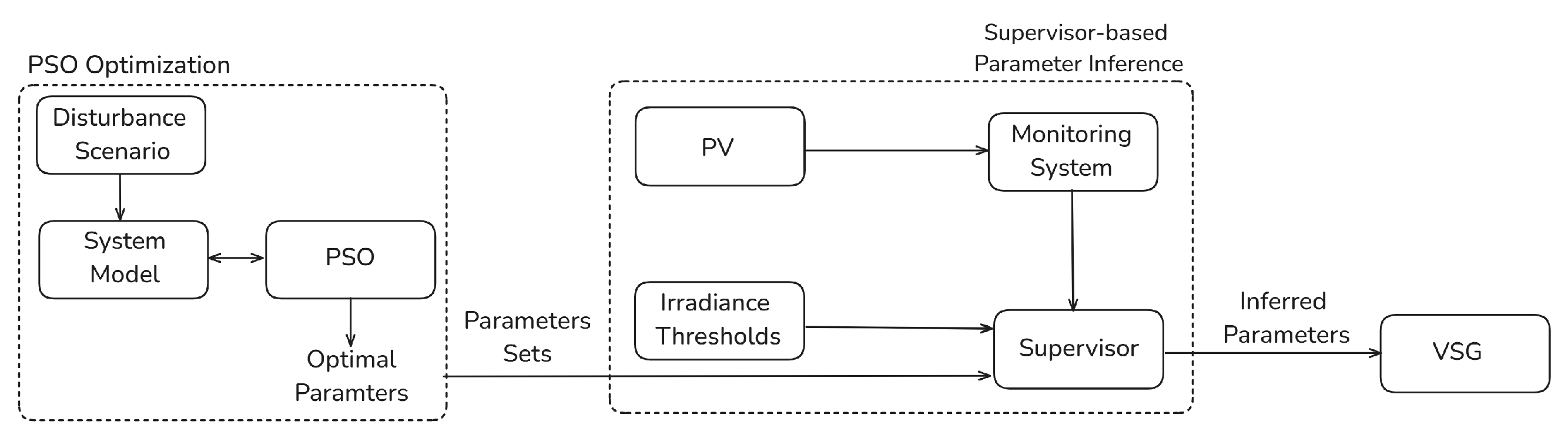 The computational burden associated with PSO is addressed in a one-time preliminary phase, enabling the adaptive Supervisory Controller to operate with lightweight decision logic. Indeed, this approach eliminates the need to perform PSO optimization every time the system conditions change, thereby reducing computational demands. PSO was chosen for its simplicity, fast convergence, and effectiveness in nonlinear, multidimensional problems. Beyond its use in the VSG context [