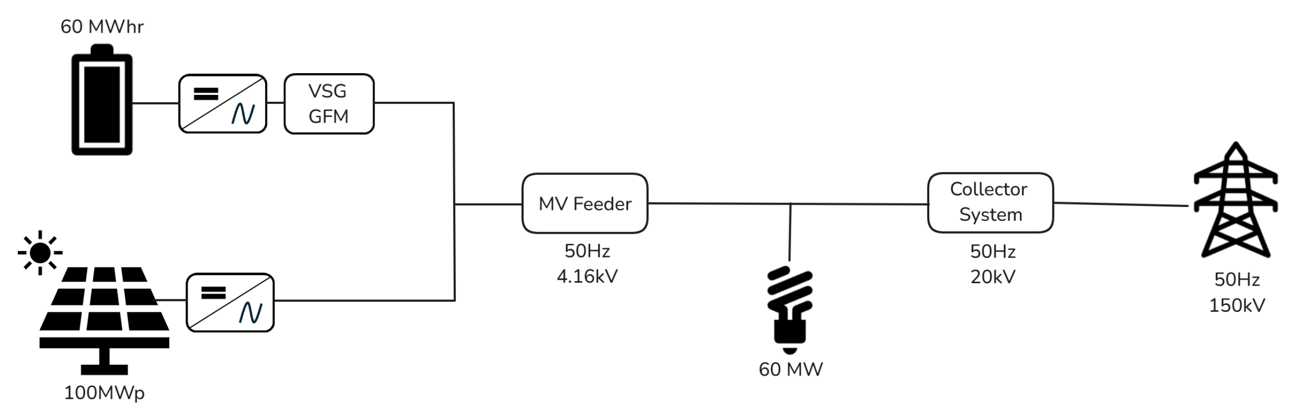Figure 2) is characterized by high photovoltaic PV penetration and comprises several main components. These include a 100 MWp PV plant, and a BESS with a 60 MWhr capacity with a peak power of 35 MW integrated with a VSM operating in GFM. The system features a 50 Hz medium-voltage grid operating at 20 kV, a high-voltage grid running at 150 kV, and a 60 MW real power load. The PV plant features two three-phase central inverters, each capable of delivering a maximum power of 50 MW at 25 °C and 1000 W/m