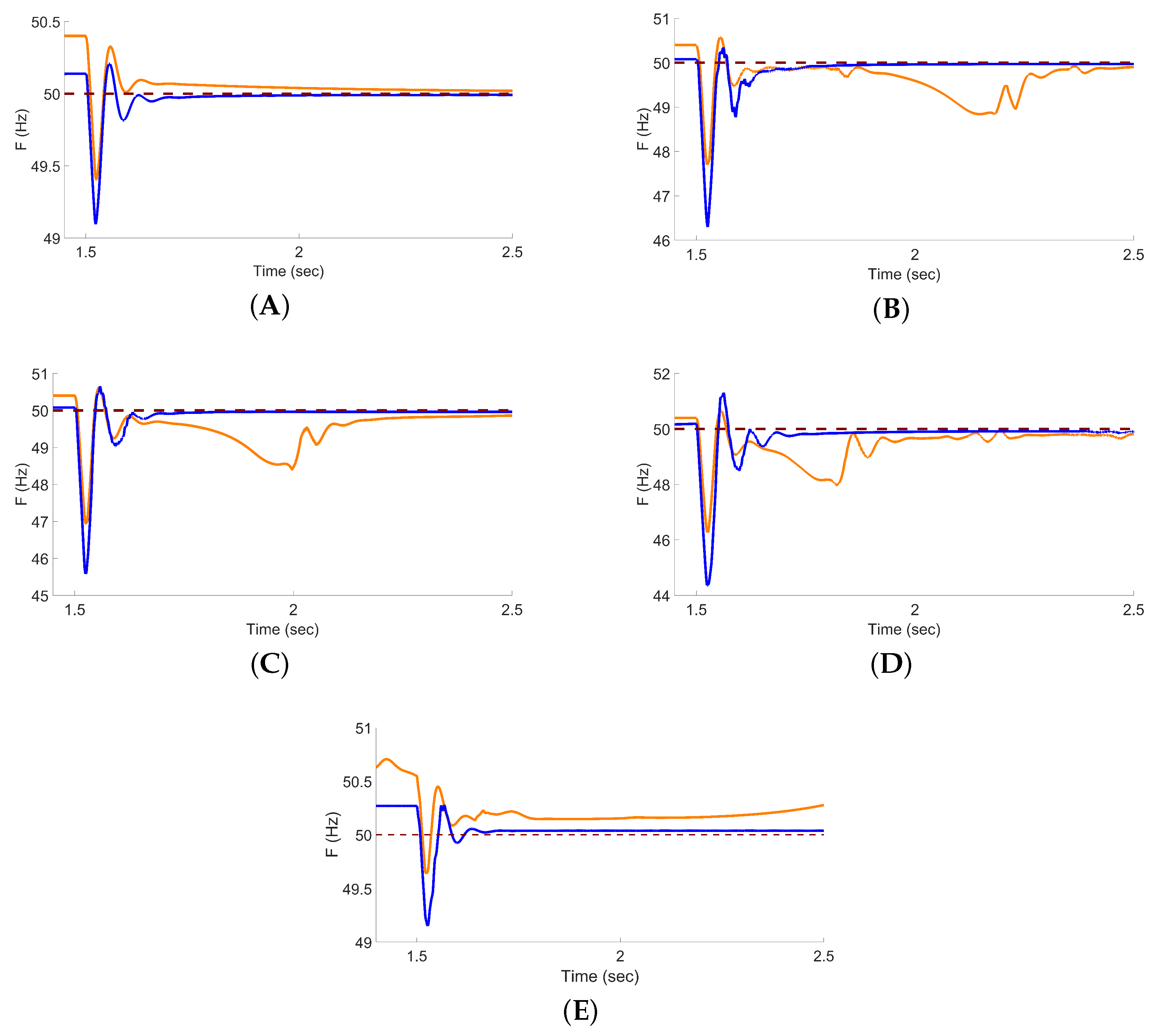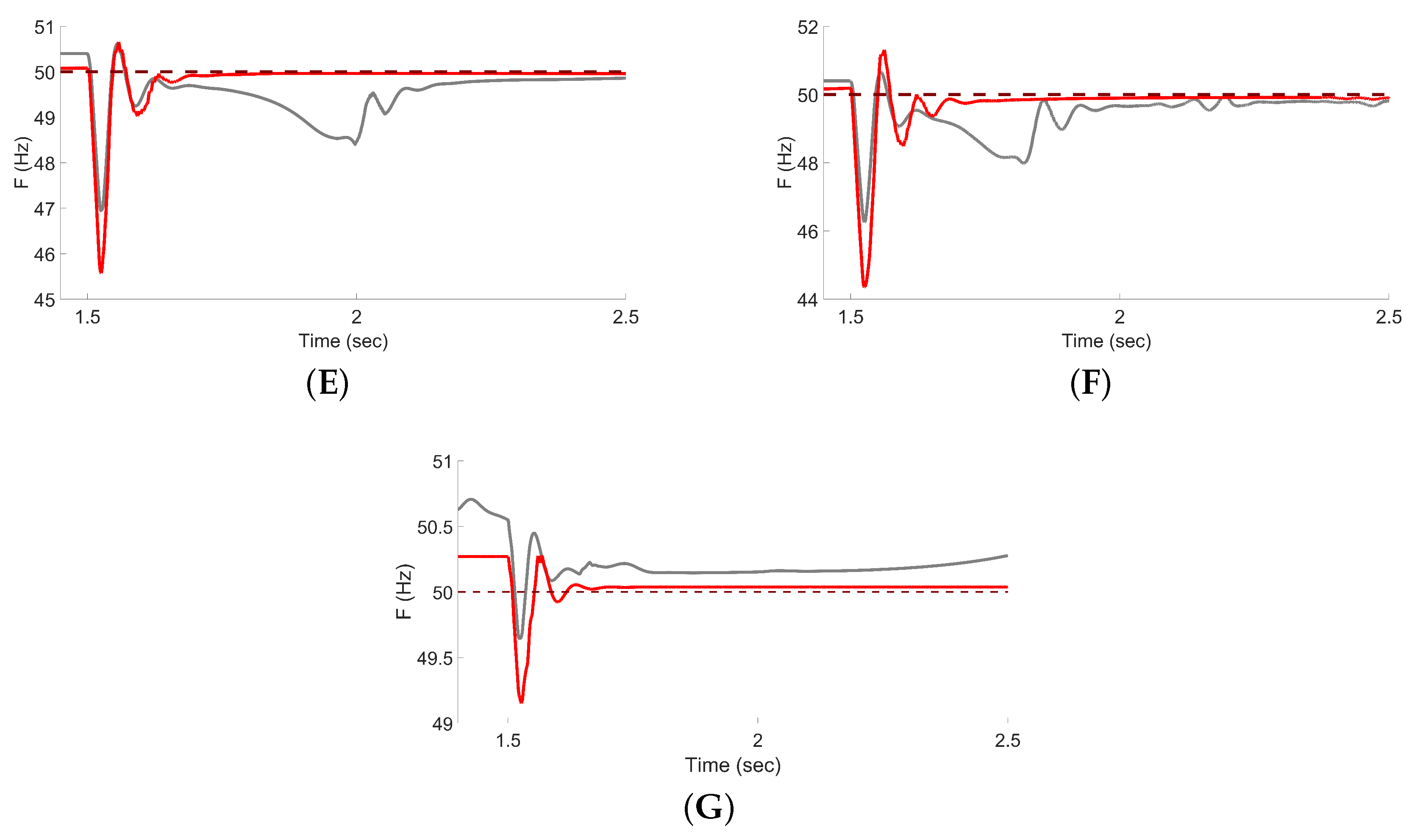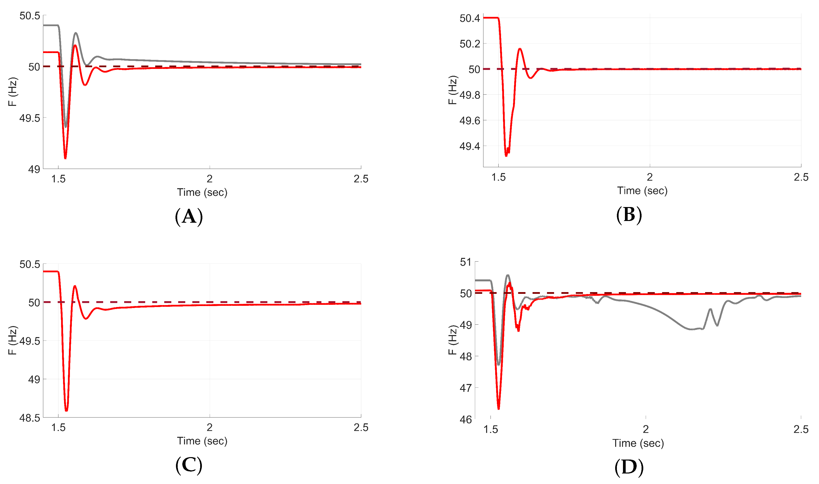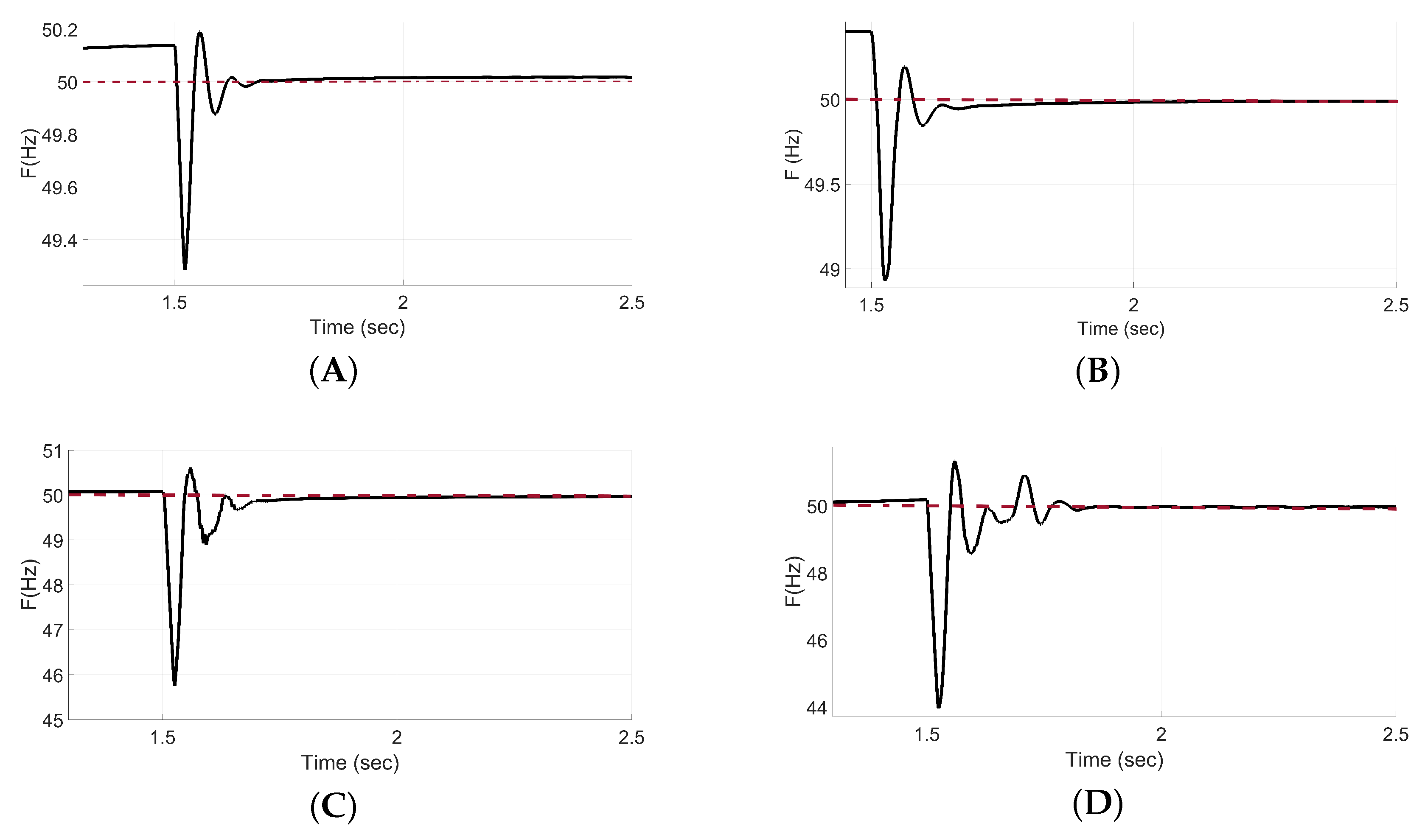 Table 6, increasing irradiance drops from 20% to 80% lead to larger initial deviations, more pronounced oscillations, and higher IAE values—particularly at 60% and 80%—underscoring the growing difficulty of maintaining frequency stability as PV power reductions become more severe. Despite these challenges, the parameter sets obtained through the PSO enable the system to eventually stabilize, with the frequency returning to its nominal value in all cases.