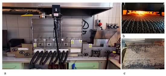 Seven samples with a weight of 5 kg each were prepared from both fuels, intended for the analysis of flue gas generated following their combustion in an experimental boiler with a power of 25 kW. The first sample consisted of 100% fine coal. The second sample was prepared with a weight ratio of 20% fine coal to 80% refuse-derived fuel through the precise mixing of both fuels in a rotary drum. Then, samples 3 to 6 were also mixed, according to the following proportions of fine coal to refuse-derived fuel, respectively: sample 3 consisted of 40% and 60%; sample 4, 50% and 50%; sample 5, 60% and 40%; and sample 6, 80% and 20%. Finally, sample 7 contained 100% refuse-derived fuel. Thus, the prepared samples were subjected to thermal conversion in a stoker-fired laboratory boiler designed for solid fuel combustion under controlled conditions [25] (Figure 1). The samples were burnt under identical conditions, one after another, at an airflow rate of 0.8 m3/min and an average fuel transfer velocity on the conveyor belt of 83 mm/min.