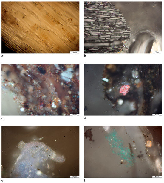 Photomicrographs with examples of organic matter—biomass (a) end charcoal (b), inorganic matter—ash (c) end rust (d), petroleum products—plastic (e,f).