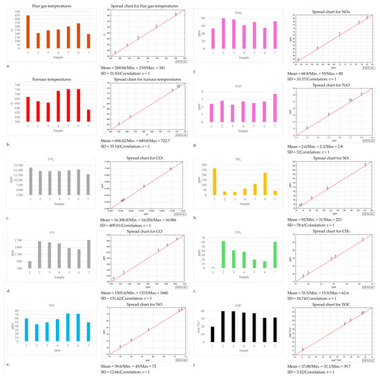 The gas component emissions were measured using VARIO luxx MRU [26] and Testo 330 [27] stack gas emission analysers for extended industrial combustion measurements, which enable the measurement of O2, CO2, CO, NO, NOx, and SO2 emissions as well as flue gas temperature and furnace temperature. Additionally, the Gasmet Gt 5000 Terra analyser was used to measure the following chemical compounds in the flue gas: N2O, NH3, CH4, HCOH, and TOC. During the combustion of individual samples, dust was also collected on filter paper using an isokinetic particle sampling probe. The content of toxic elements that accompany emissions (arsenic, cadmium, cobalt, chromium, copper, manganese, molybdenum, nickel, mercury, and lead) in the collected dust was determined using a Vanta XRF spectrometer.