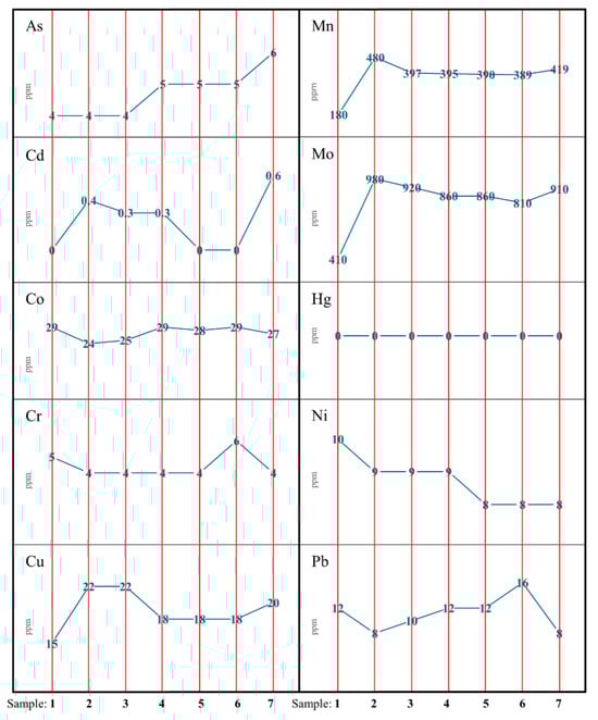 Figure 4 illustrates the elemental concentration distributions of all samples in order to visualise the diversification of their contents in both the individual fuels and their compositions. In the analysed mixtures, a slight upward trend in the accumulation of arsenic, manganese, and molybdenum was observed, while the concentration of cobalt and chromium remained at a similar level across all samples. Conversely, nickel showed a lower concentration in samples with less of the residual fraction. Mercury was not detected in the dusts, whereas cadmium was noted in trace amounts in the tested samples. The concentrations of copper and lead were difficult to correlate with the dominant fraction in the mixtures, despite the large disparity in their content in the precursors. The probable cause of this phenomenon is the carriers of these elements in the waste [53,54]; however, additional research into the residual fraction is required to precisely determine the component responsible for their accumulation.