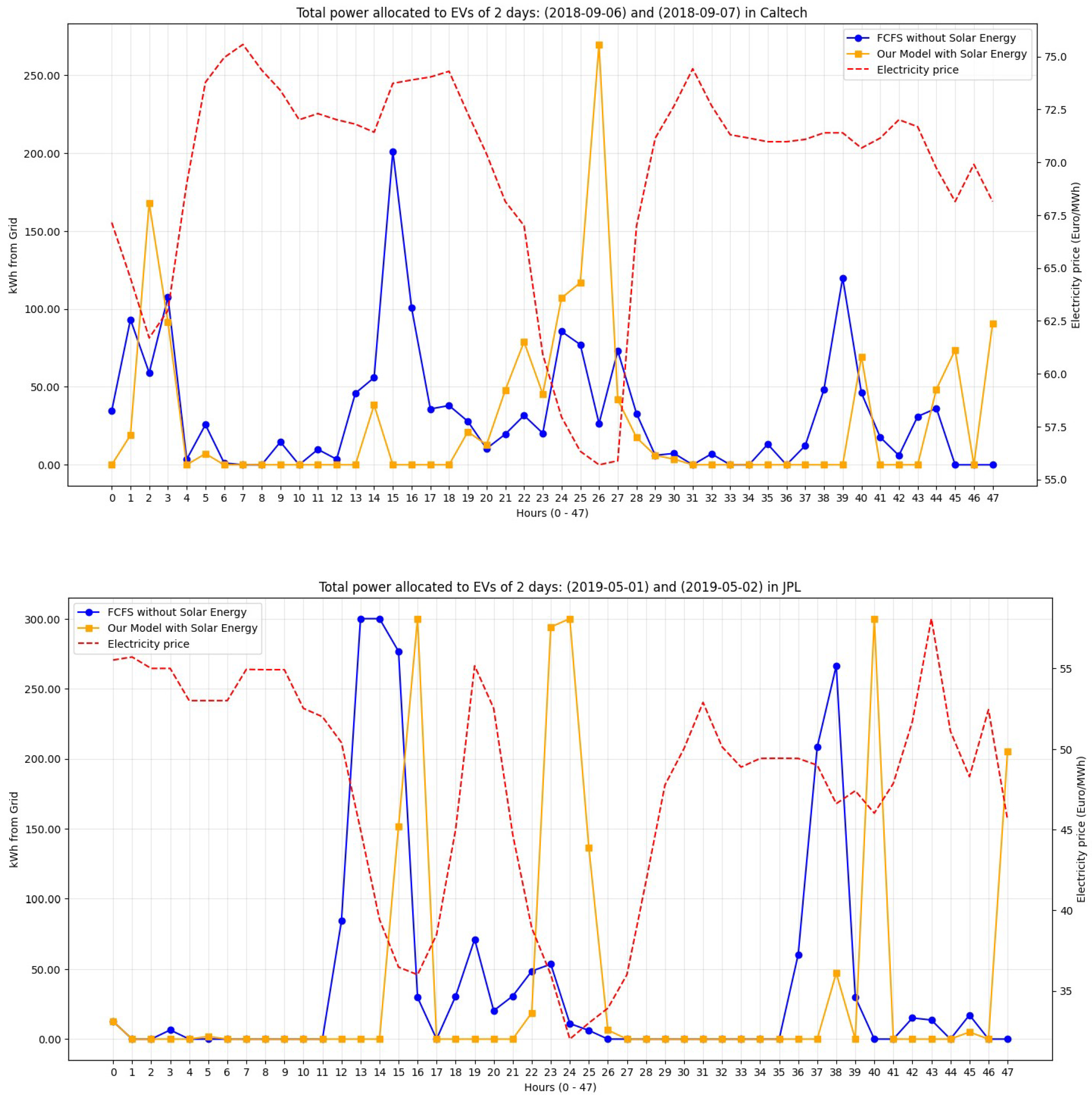 Several straightforward solutions have been considered for managing EV charging, such as the “First Come, First Served” (FCFS) principle, which guarantees equity by servicing vehicles in the sequence of their arrival. However, FCFS lacks consideration of critical factors such as electricity pricing, real-time energy demand, and overall impact on the power grid. This limitation can lead to inefficient energy allocation, increased operational costs, and potential grid instability, especially during peak demand periods.