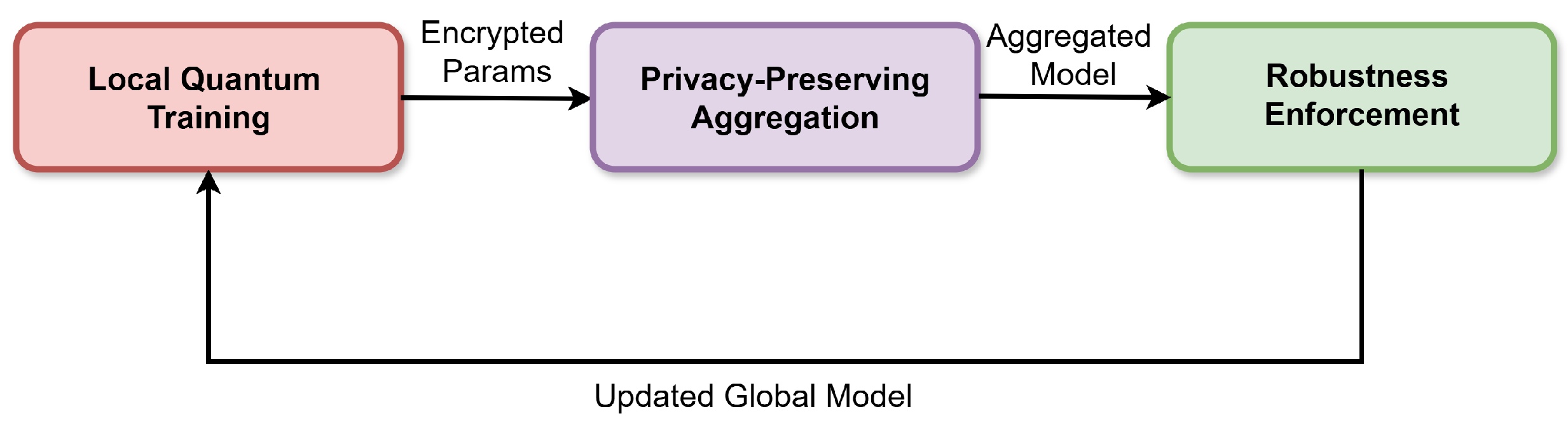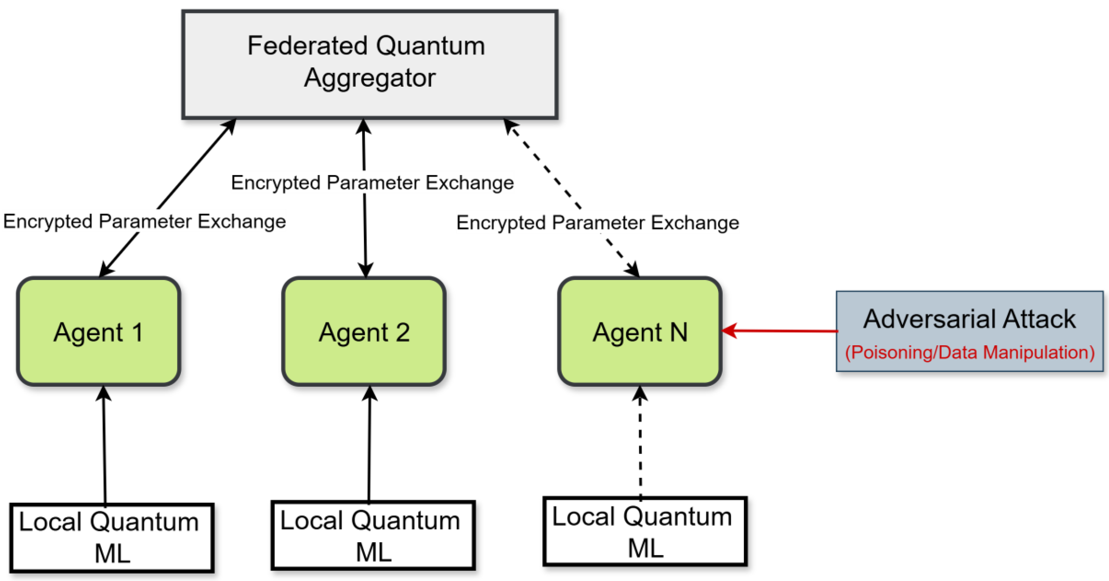 Figure 1 illustrates the overall system architecture, highlighting decentralized quantum training, secure aggregation, and the attack surface.