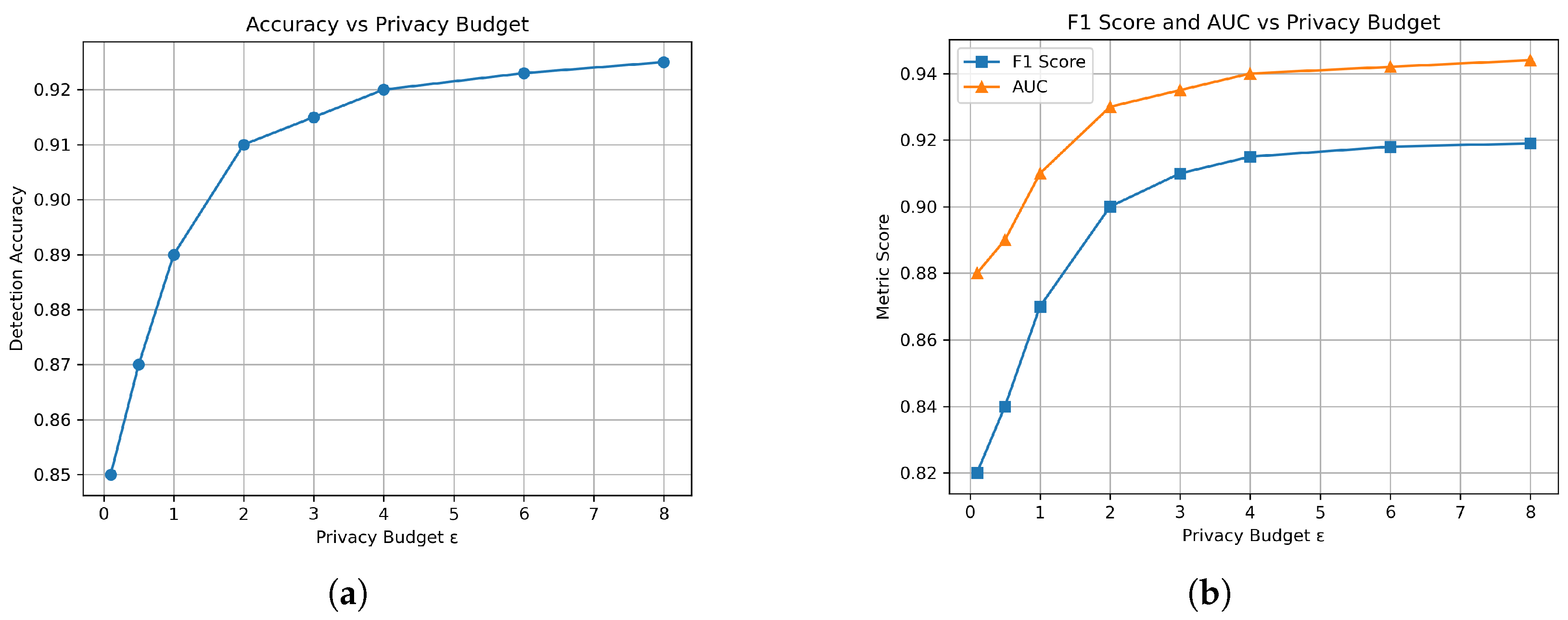 Figure 9, the framework maintains a high detection accuracy, exceeding 90% even under strict differential privacy budgets (e.g.,
