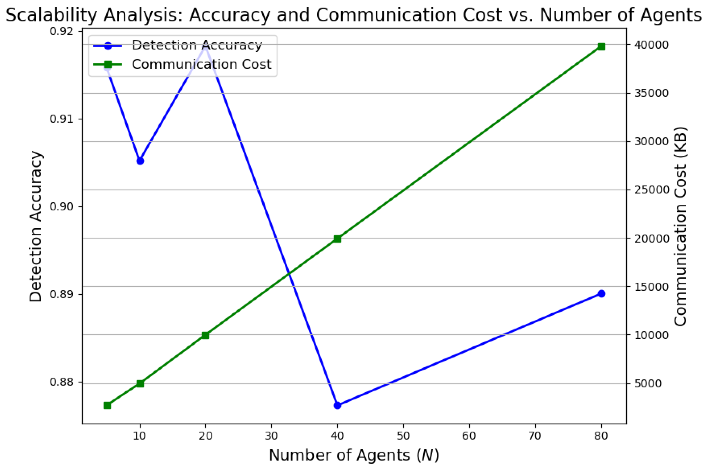 Figure 11 reveals that as the number of participating agents grows from 5 to 80, detection accuracy degrades by less than 3%, while communication costs linearly increase, remaining within acceptable operational bounds.