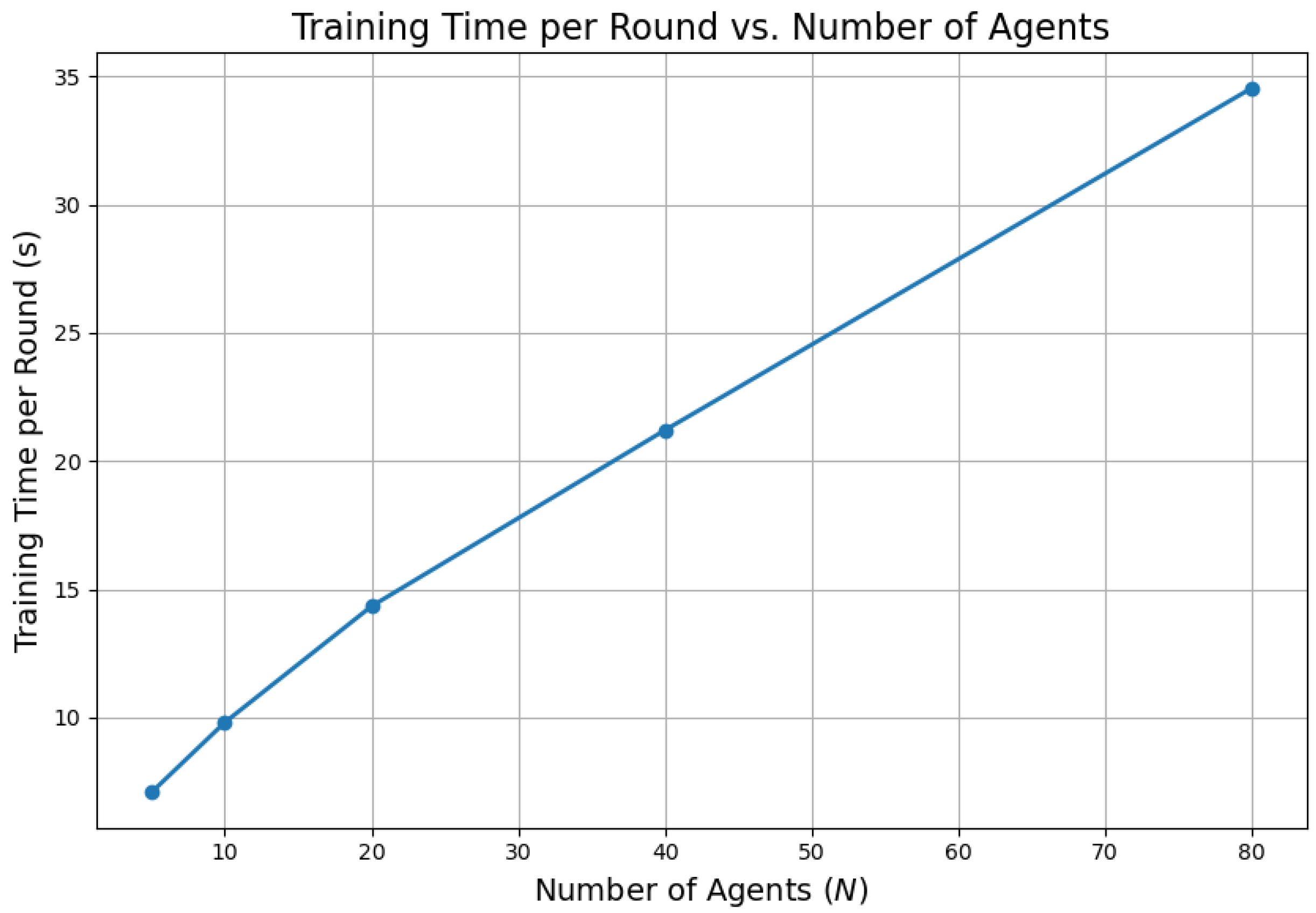 Figure 14 demonstrates that the FQML framework maintains linear growth in training time per round, with no signs of bottlenecks as the agent population increases. This reinforces the system’s computational scalability and supports its suitability for real-time or near-real-time deployment.