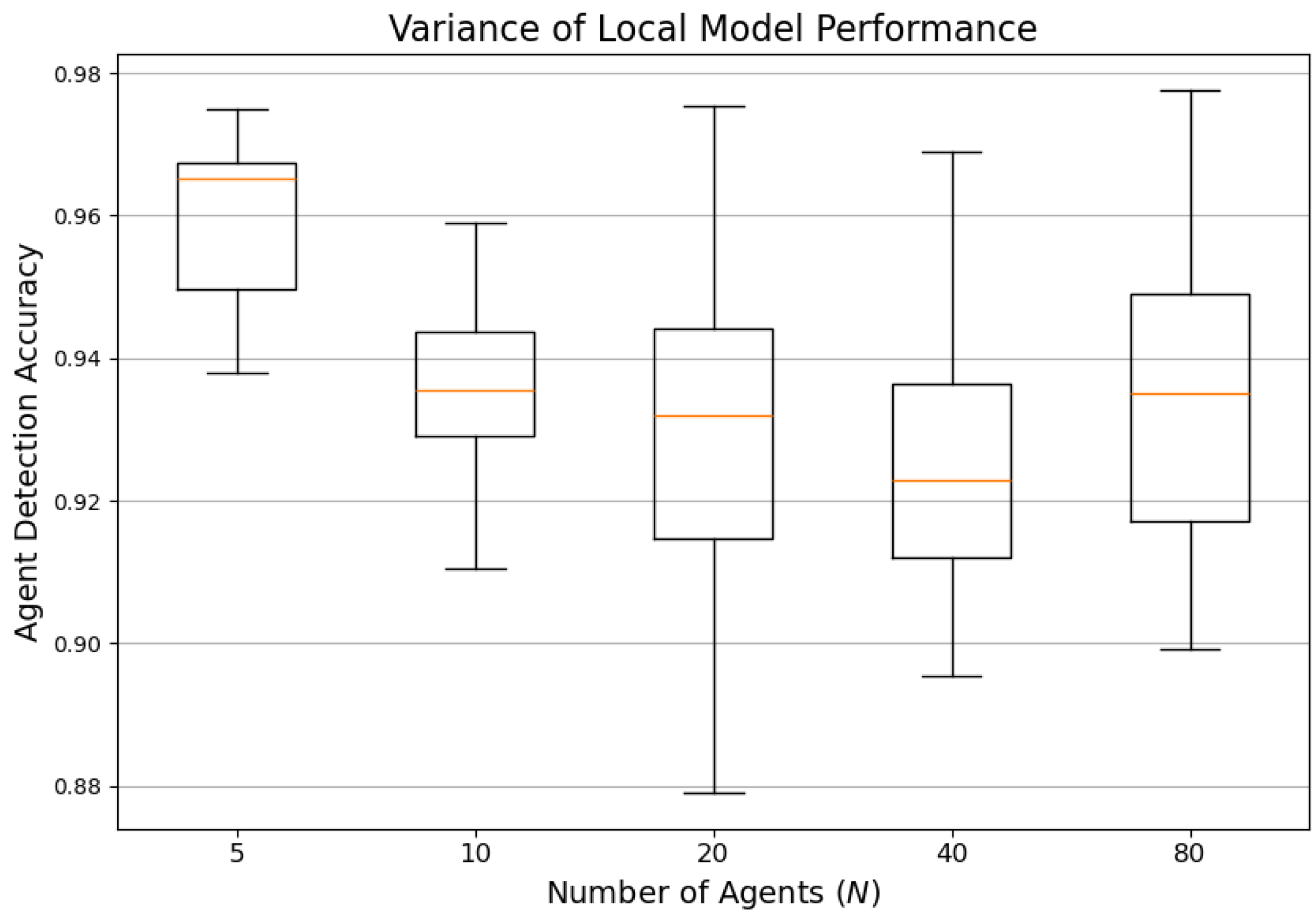 Figure 15 presents the distribution of local model accuracy across agents, revealing narrow interquartile ranges and low variability. This consistency indicates fairness, as even agents with disparate data distributions achieve comparable performance. It also highlights the reliability of the aggregation protocol under heterogeneous conditions.