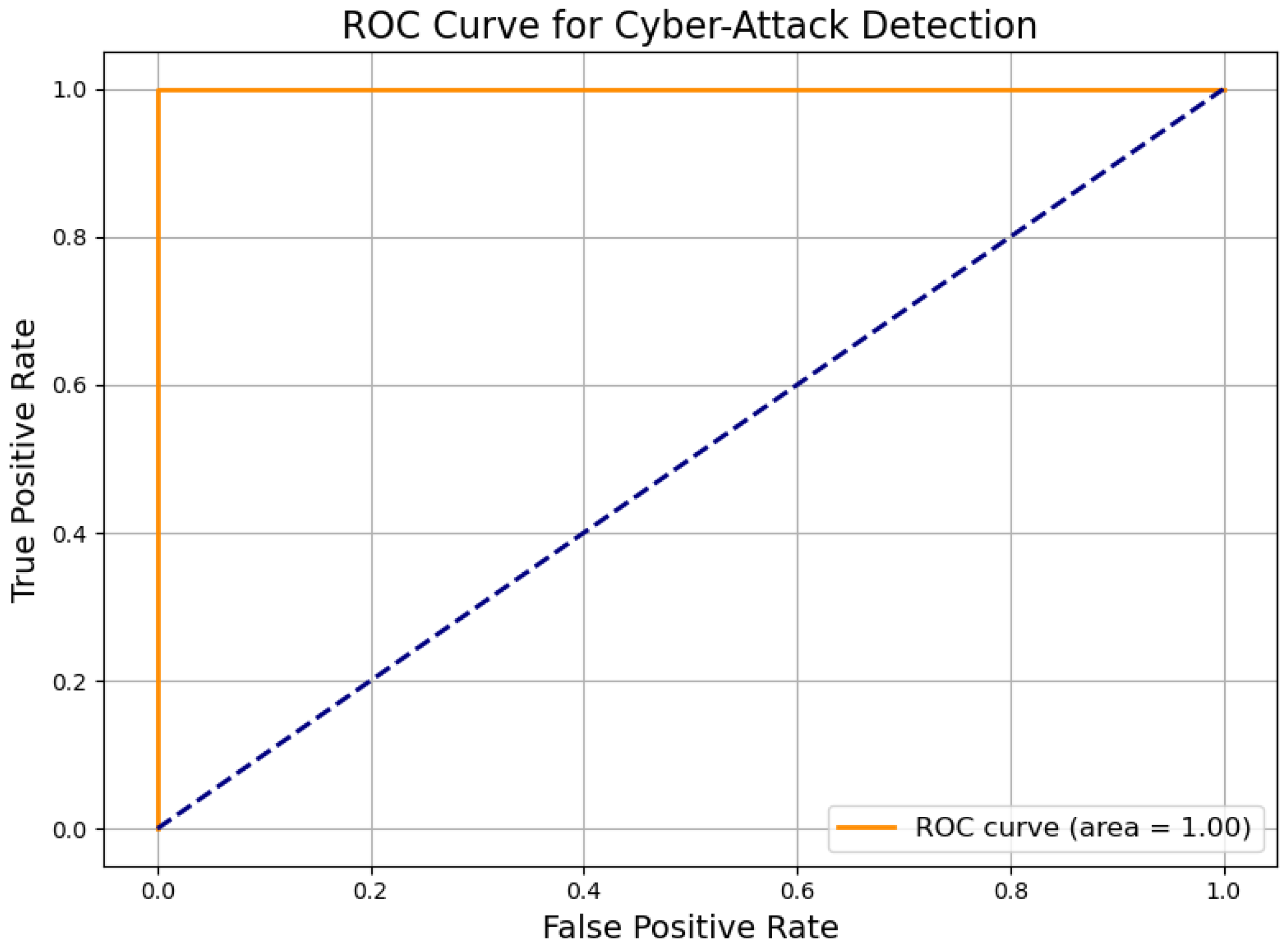 Figure 17 further emphasize operational viability, with high precision, recall, and an AUC of 0.96, indicating excellent sensitivity–specificity balance. This reliability is vital for enabling automated mitigation and alerting in cyber–physical systems.