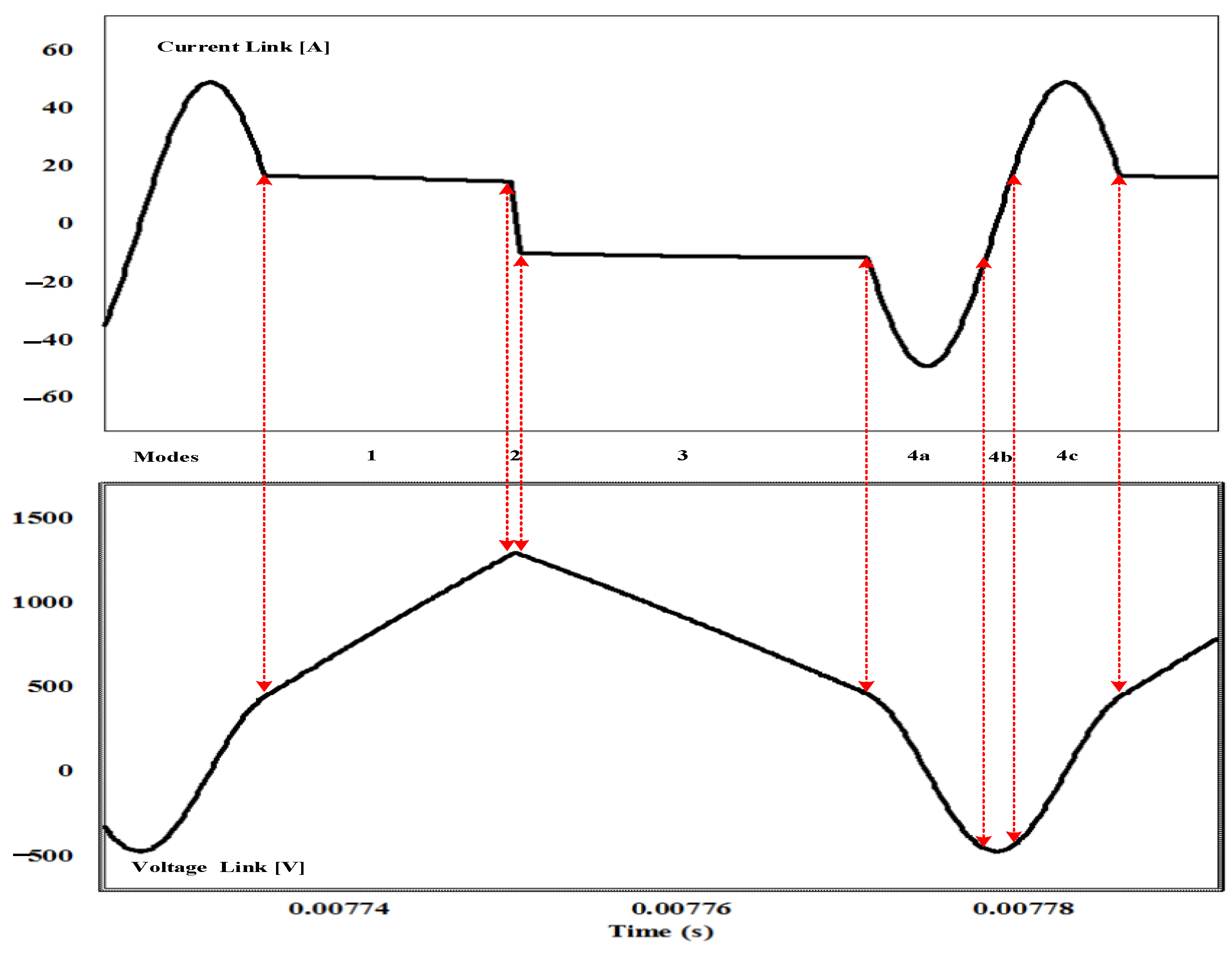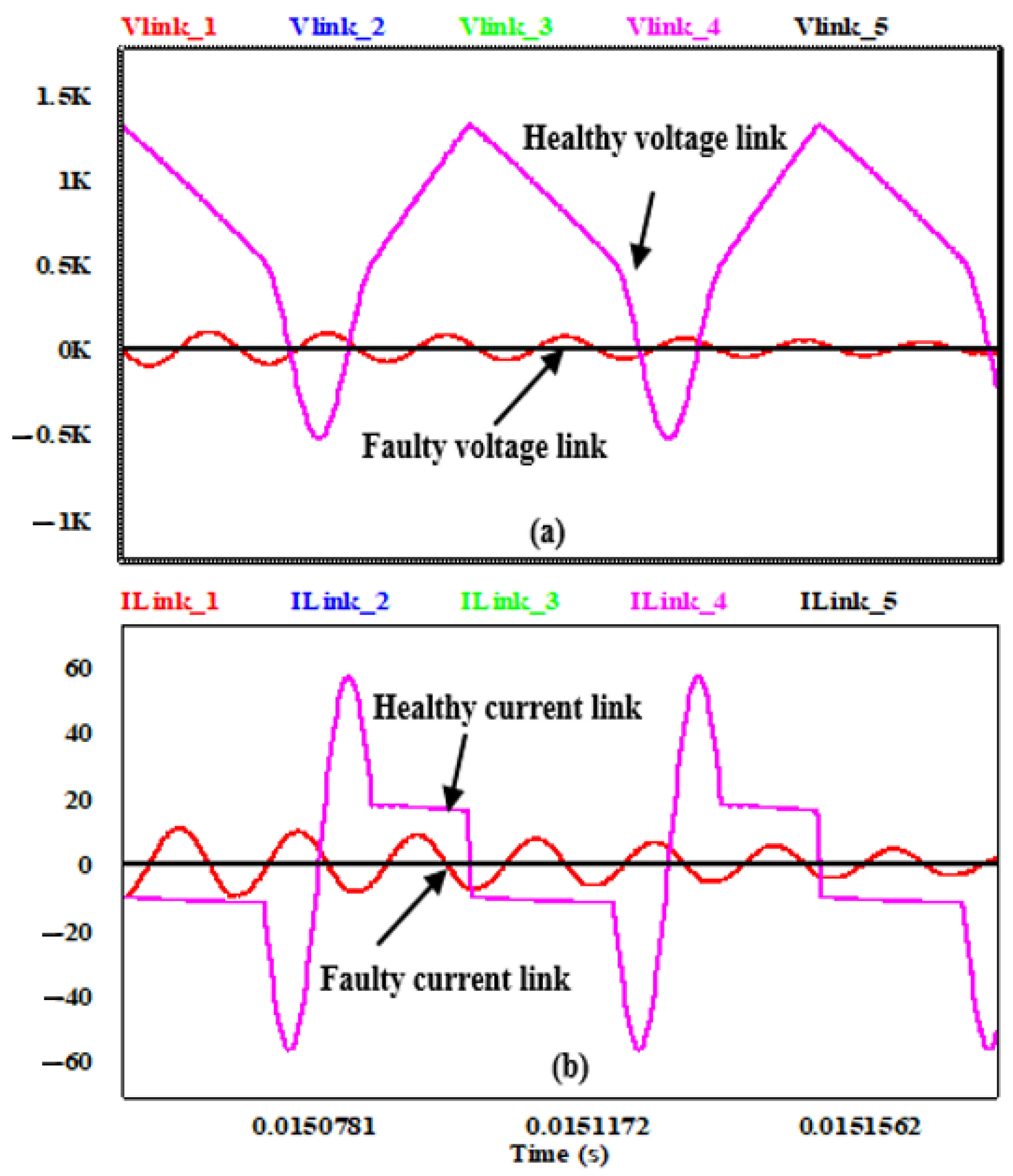 The behavior of link voltages and currents during the fault at the faulty and healthy power modules: (a) Link Voltages and (b) Link Currents.