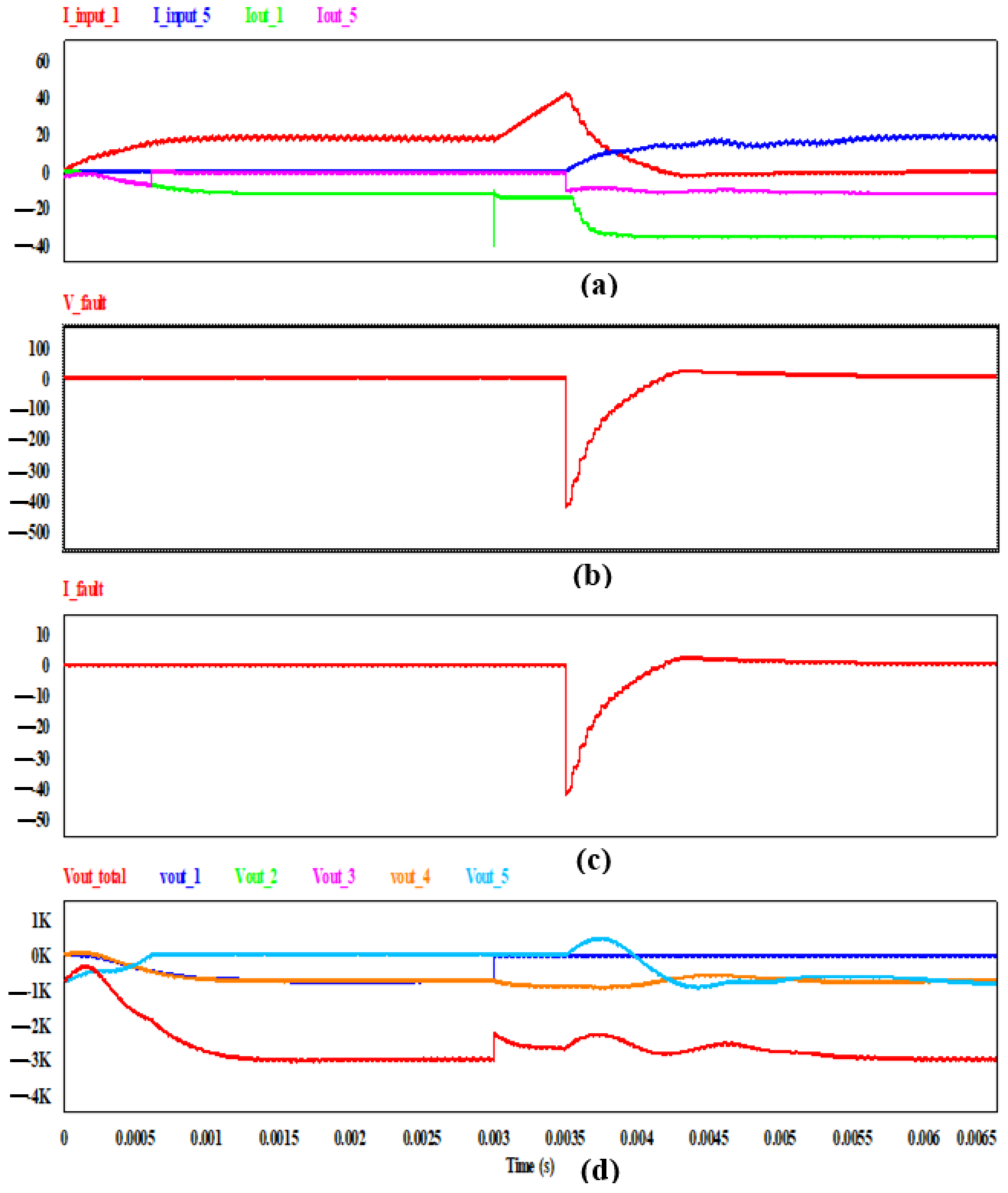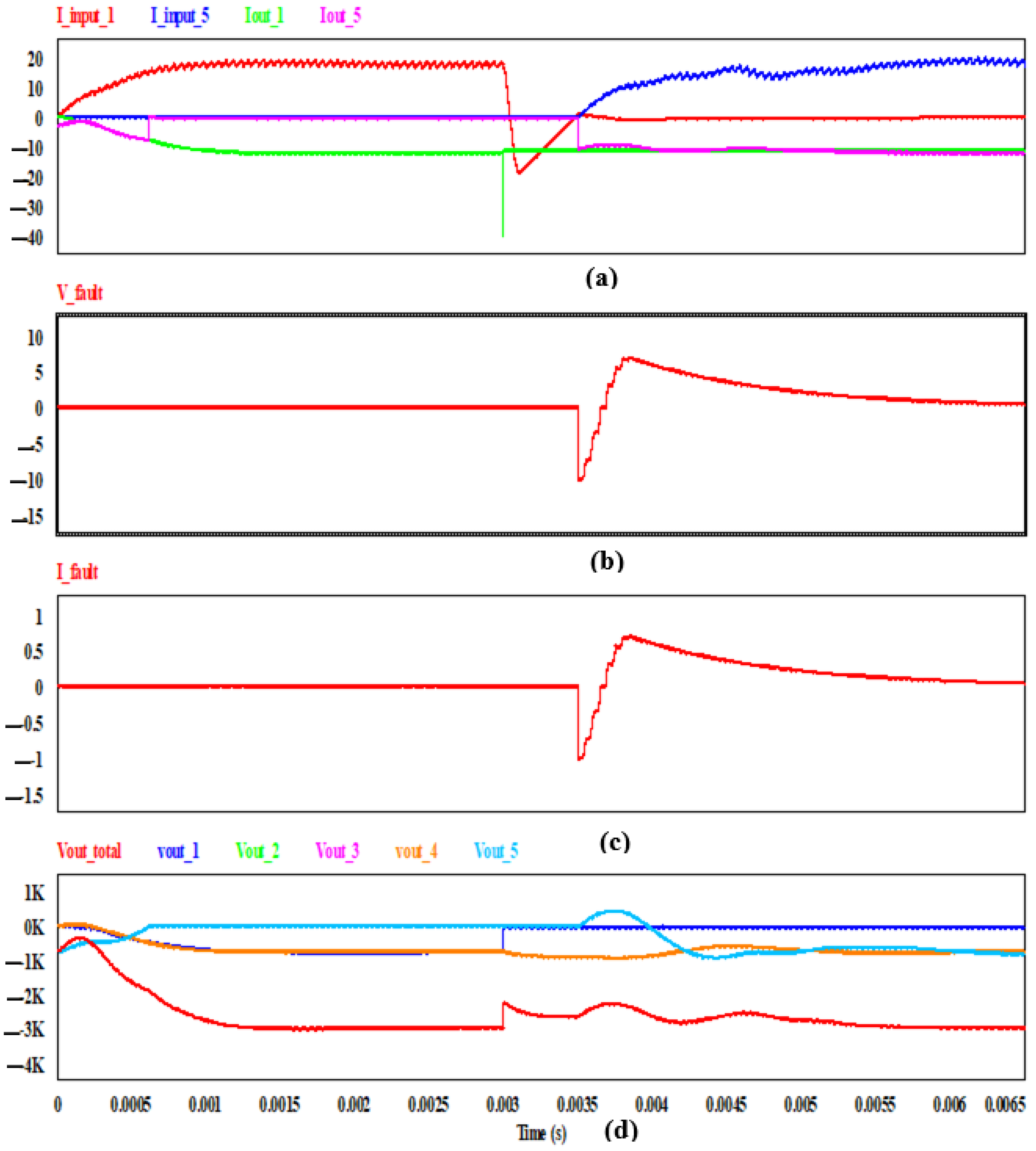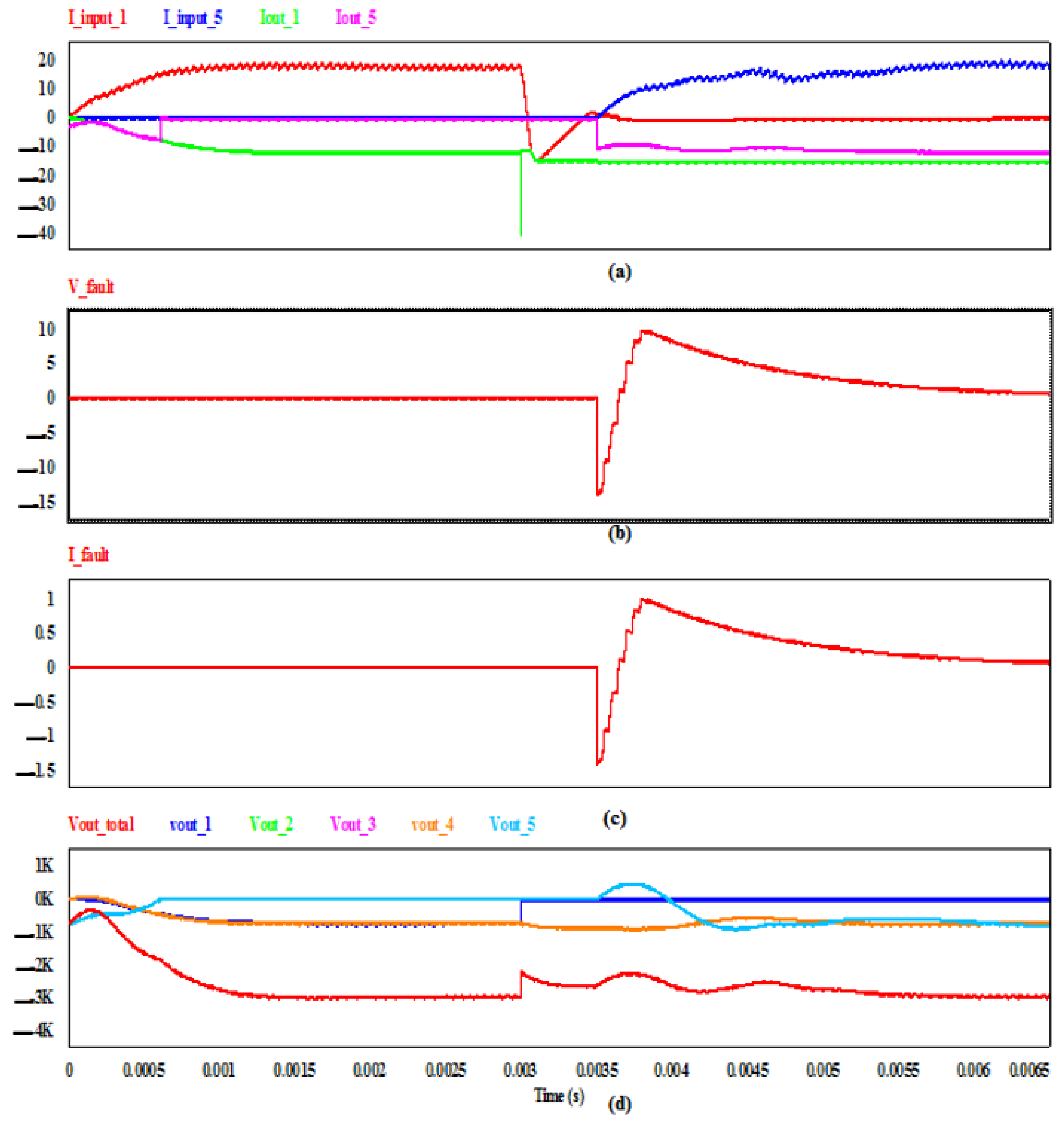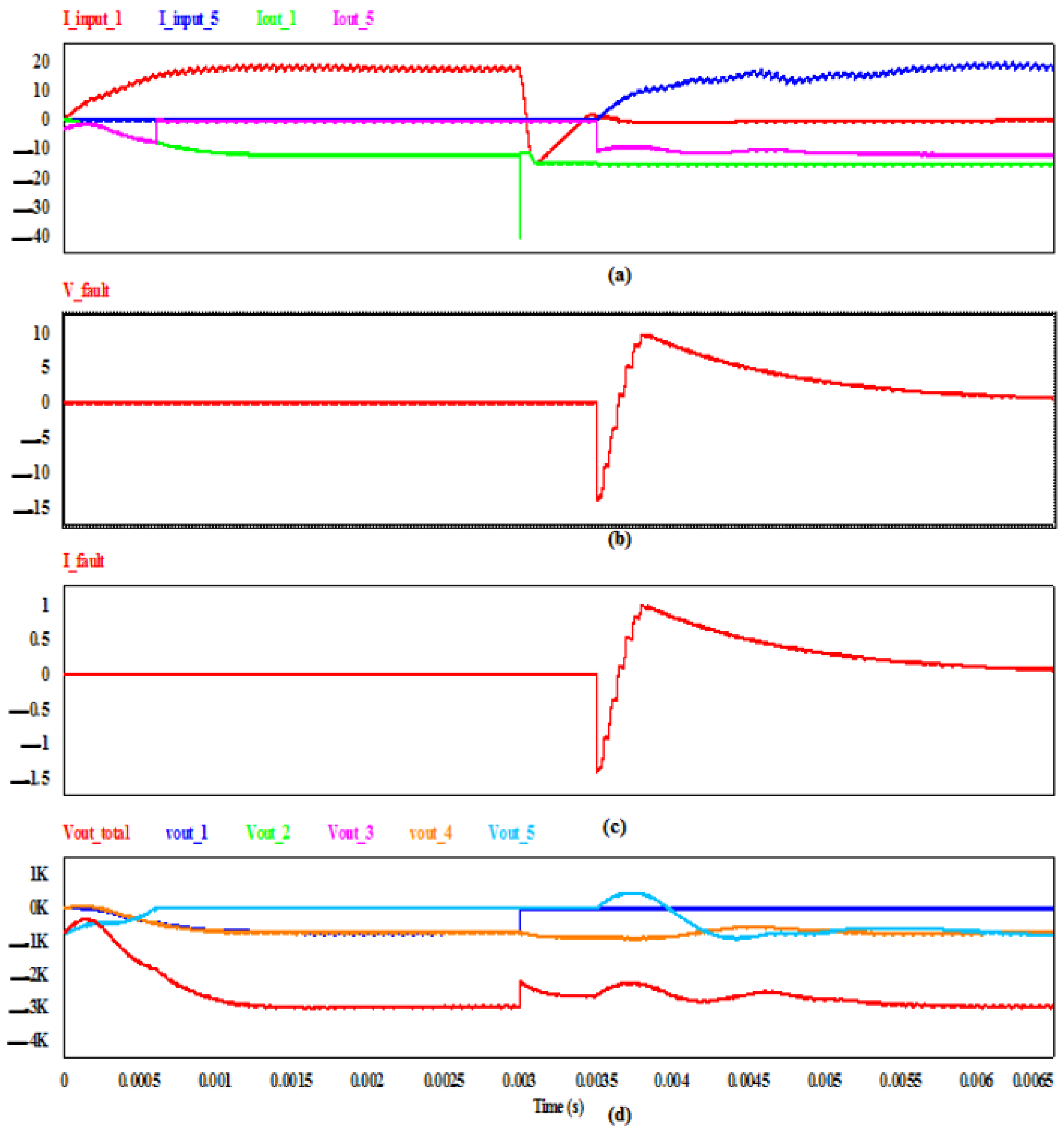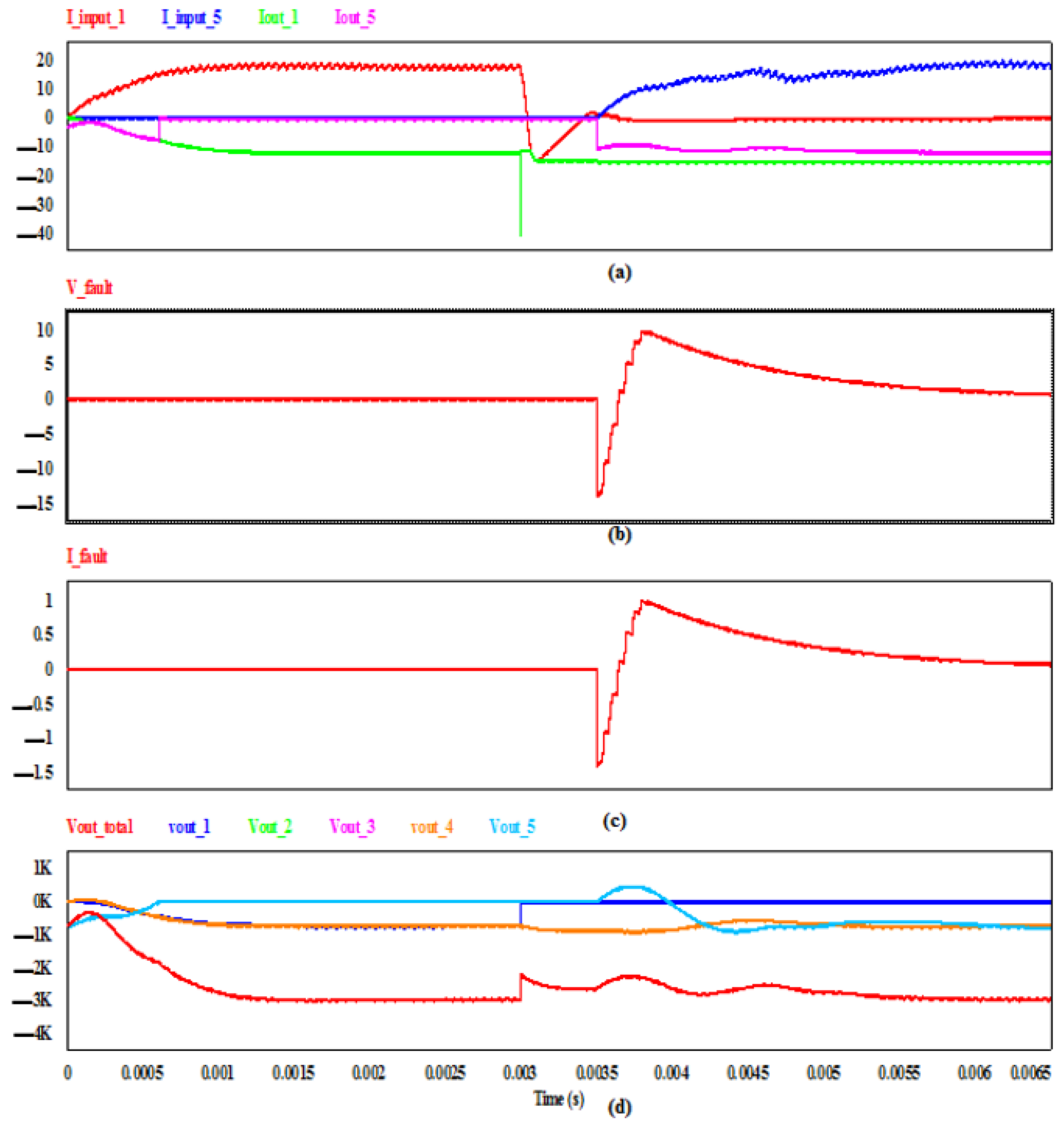 The behavior of the converter during healthy and faulty conditions for case 5: (a) input and output currents (b) the faulty voltage (c) the faulty current and (d) output voltages and total output voltages.
