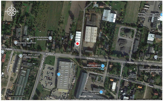 To reflect actual air quality conditions in a rural–urban area, the sensor was located in Pleszew in an area with a low concentration of residential development, devoid of tall buildings and industrial plants. The sensor’s location partially borders agricultural land, which allowed for air circulation and eliminated the impact of road transport on air pollution readings. Figure 1 shows a site plan of the measurement station location.
