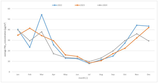 Section 3.1 presents the monthly averages of PM10 values, along with graphs and a discussion on the observations. Particular attention is paid to the analysis of seasonality, in the autumn–winter months (heating season) and in the spring–summer months, to demonstrate the relationship between PM10 concentrations and the heating season.