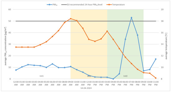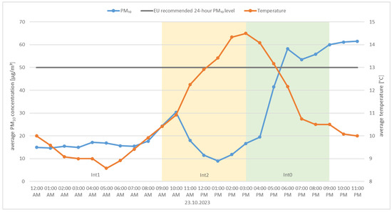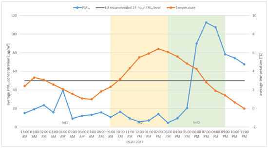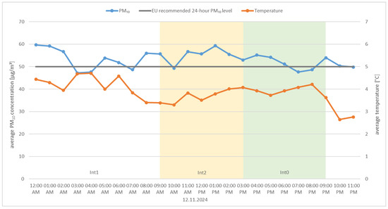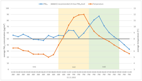 • Daily changes in air pollution indicators resulting from the operating characteristics of boilers with manual fuel loading. Technical data regarding the operation of these devices indicate that the boilers have a burn time of up to 24 h; unfortunately, in real conditions, the burn time is limited to a range of 6 to 12 h, depending on the outside temperature and the amount of fuel loaded [43,44].