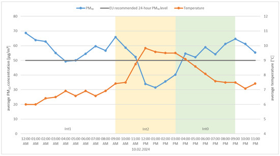 The study results demonstrated a significant relationship between temperature and particulate matter concentrations during the heating season. The temperature drop resulted in increased boiler operation, and the observed phenomena were additionally related to residents’ lifestyles. Detailed statistical analysis of the data from 2022 to 2024, including linear regression models and analysis of variance (ANOVA), confirmed the key role of hand-fired grate boilers in shaping pollution levels. The developed PM10–temperature regression model allowed for the prediction of local emission levels. Additionally, Tukey’s post hoc tests were used to analyze the differences between average concentrations in three daily intervals. Graphical visualization was achieved using violin plots with boxplots.