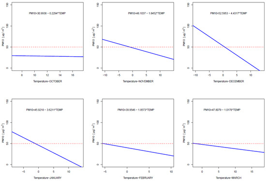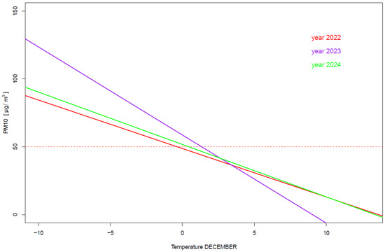 In Section 3.3, the correlation coefficients between PM10 values and temperature are determined separately for each month, and a mixed linear regression model is presented. An extension of this analysis, as well as a presentation of the simple regression models describing the PM10–temperature relationship for each month and each year separately, is included in Section 3.4. Furthermore, mixed linear regression models were estimated, which enabled the forecasting of monthly PM10 values in the future based on data from the years 2022–2024.