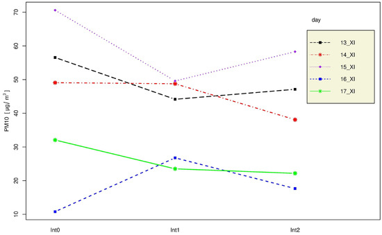 Table 4. p values for analysis of variance (comparisons of average PM10 contents) of three time intervals (ANOVA) for five sample days in November 2022.