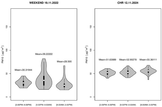 Figure 19. Violin charts of PM10 concentration during time intervals for two example days: a WEEKEND day and a CHR day.