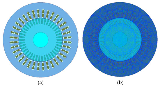 Two-dimensional finite element model of induction motor for electric vehicle: (a) finite element model; (b) grid partitioning.
