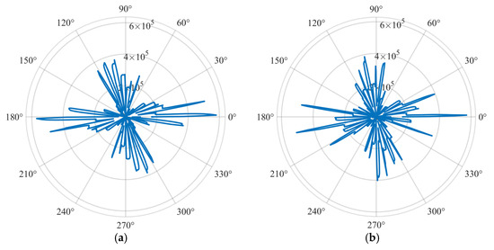 To obtain more accurate analysis results, finite element models were established for the 42-slot rotor and the 53-slot rotor. In the modeling process, the total slot opening width of the rotor was kept constant to better analyze the impact of the number of rotor slots on motor performance. The radial electromagnetic force wave distributions along the air gap circumference for the two motors with 36/42 slot configurations and 36/53 slot configurations are shown in Figure 4a,b.