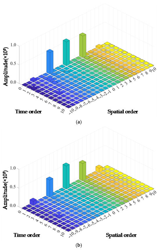 The radial electromagnetic forces of two motors with 36/42 slot configurations and 36/53 slot configurations were analyzed using two-dimensional Fourier decomposition, and the harmonic content is shown in Figure 5a,b. Analysis reveals that the spatial harmonics of the 4th and 8th orders have relatively high content. This is because the spatial harmonic components of the radial electromagnetic force exhibit characteristics related to the number of poles of the motor; the temporal order is an integer multiple of the electrical frequency. Among the various harmonics, those with both spatial and temporal order of 0 have the most prominent amplitude. These harmonics belong to the DC component of the electromagnetic force and do not cause dynamic excitation of the motor structure. By changing the number of slots in the rotor’s 53 slots, the frequency distribution of the electromagnetic force waves was adjusted, effectively suppressing the second-order electromagnetic force waves that have the greatest impact on motor vibration and noise.
