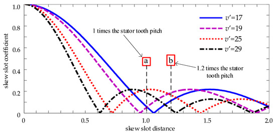 According to Equation (12), the attenuation of different harmonic orders due to the skewed slot distance can be calculated. Considering that an excessively skewed slot distance may cause significant transverse currents, leading to axial forces, increased additional losses, and reduced torque, the skewed slot distance is selected to be 0 to 2 stator tooth pitches for analysis. Analysis of the radial electromagnetic force waves in a 53-slot motor reveals that the winding phase band harmonics associated with the first-order electromagnetic force waves are the 25th harmonics, while those associated with the third-order electromagnetic force waves are the 29th harmonics. Given that the first-order tooth harmonics of the stator (17th and 19th harmonics) have relatively large amplitudes, the first-order tooth harmonics of the stator should also be considered when analyzing the effect of different skew slot distances on the skew slot coefficient. Figure 6 visually depicts the quantitative relationship curves between skew slot distance and the appropriate harmonic skew slot coefficients, illustrating the effect of skew slot distance on various harmonics.