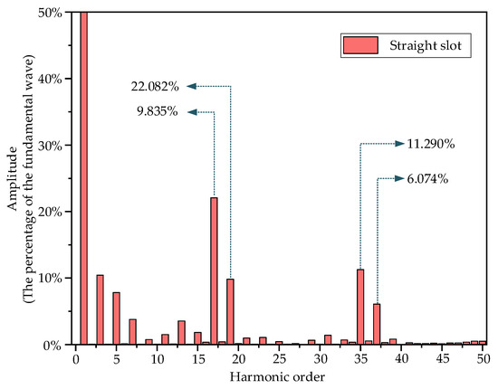 The finite element analysis method was used to verify the effectiveness of the motor rotor skew slot design. First, finite element simulation was performed on a motor with a 53-slot rotor and straight slots. Then, the air gap magnetic flux density in the simulation results was analyzed using fast Fourier transform. The analysis results are shown in Figure 7.