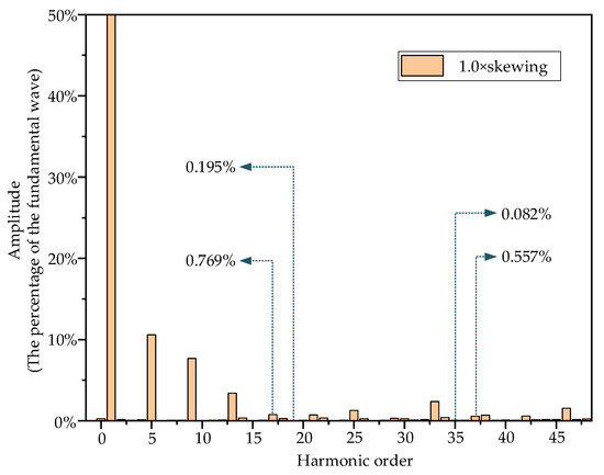 Comparing Figure 7 and Figure 9, it can be observed that for this 53-slot motor, when the rotor skewed slot distance is 1.0 times the stator tooth pitch, the first-order tooth harmonics of the stator (17th and 19th harmonics) are significantly suppressed, with their amplitudes reduced to 3.49% and 1.98% of the amplitudes in the case of straight slots. The amplitudes of the winding phase band harmonics (35th and 37th harmonics) that can induce radial electromagnetic force waves are reduced to 0.723% and 9.17% of the original straight slot case, which is beneficial for reducing the electromagnetic vibration and noise of the motor. However, this is not the optimal choice for the motor when the distance between the skewed rotor slots is 1.0 times the stator tooth pitch.