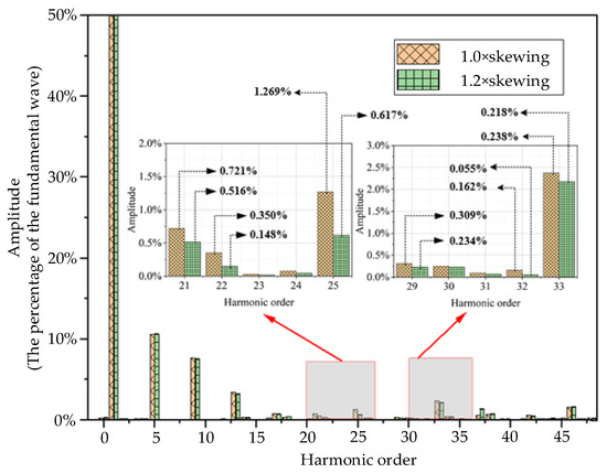 Next, a simulation analysis was conducted on a motor with a rotor skewed slot distance of 1.2 times the stator tooth pitch, and the results were compared with those of a motor with a rotor skewed slot distance of 1.0 times the stator tooth pitch, yielding the air gap magnetic flux. Fourier analysis comparison results are shown in Figure 10. By comparing the results, it can be observed that the motor with a rotor skew slot distance of 1.2 times the stator tooth pitch exhibits similar harmonic suppression effects for specific harmonics (stator first-order tooth harmonics and winding phase band harmonics) as the motor with a rotor skew slot distance of 1.0 times the stator tooth pitch. However, compared to the motor with a rotor skew slot distance of 1.0 times the stator tooth pitch, the motor with a rotor skew slot distance of 1.2 times the stator tooth pitch has the following advantages: the 25th winding phase band harmonic associated with the motor’s first-order radial electromagnetic force wave and the 29th winding phase band harmonic associated with the motor’s third-order radial electromagnetic force wave are both better suppressed; Specifically, the content of the 25th harmonic decreased from 1.269% to 0.617%, and the content of the 29th harmonic decreased from 0.309% to 0.234%, which validates the previous analysis regarding the skew coefficient and skew angle. Based on this, the motor with a skewed slot distance of 1.2 times the stator tooth pitch further reduced the 21st, 22nd, 32nd, and 33rd harmonics. The reduction in these harmonic contents can more effectively prevent motor resonance, reduce electromagnetic vibration, and lower noise. Therefore, for this 53-slot motor, a rotor skewed slot distance of 1.2 times the stator tooth pitch is the optimal choice.