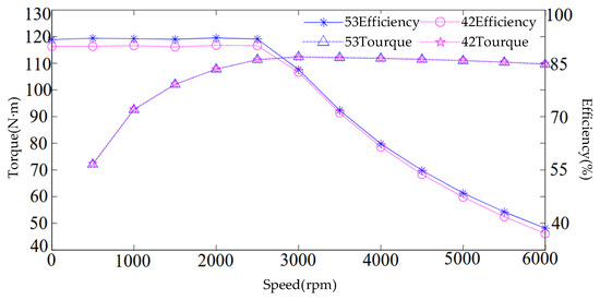 Rotor skewing not only affects the electromagnetic vibration and noise of induction motors but also impacts performance metrics such as electromagnetic torque and additional losses. Considering the application in electric vehicles, the focus is on electromagnetic performance at the base speed point and maximum speed point. Therefore, further analysis is conducted on the maximum electromagnetic torque and efficiency performance of the motor after rotor slot skewing. Figure 11 shows the maximum electromagnetic torque and efficiency curves across the entire speed range for a 53-slot rotor motor with a skew distance of 1.2 times the stator pitch and a 42-slot straight-slot rotor motor. Comparing the performance of the 53-slot rotor with a skewed slot distance of 1.2 times the stator pitch and the 42-slot straight-slot rotor in Figure 11 reveals that the optimized rotor achieves a 2.8% improvement in electromagnetic torque at the base speed point and a 4.9% enhancement in performance at the maximum speed point compared to the original rotor. The motor’s efficiency remains essentially unchanged across the entire speed range. Consequently, the optimized rotor demonstrates superior electromagnetic torque performance.
