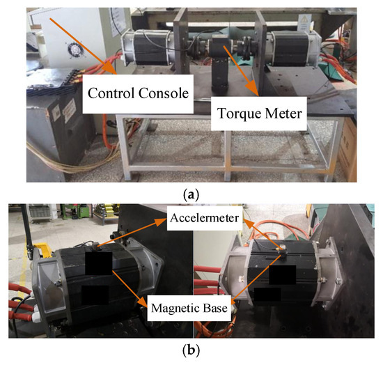 To ensure the accuracy and validity of the experiments, this research employed a method of replacing the rotor within the same stator to evaluate the torque performance, efficiency characteristics, and electromagnetic vibration properties of both rotor types. Performance assessments of the two rotors were conducted on a motor drag test bench, as illustrated in Figure 12. The electric vehicle induction motor drag test bench incorporates a torque measuring instrument. Its control console features a power meter and current sensors, enabling measurement of the motor’s torque and efficiency characteristics. Electromagnetic vibration characteristics were measured using an accelerometer sensor mounted on a magnetic base fixed at the center of the motor stator core. Radial electromagnetic forces directly act on the stator, inducing radial electromagnetic vibrations. Since the motor’s shaft coupling acts on the rotor, its influence on radial electromagnetic vibrations can be neglected.