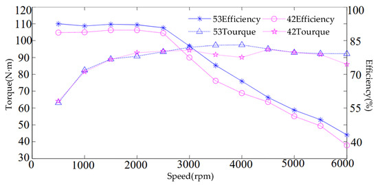 Measured torque and efficiency of the 53-slot rotor with 1.2× skewing and the 42-slot straight rotor.
