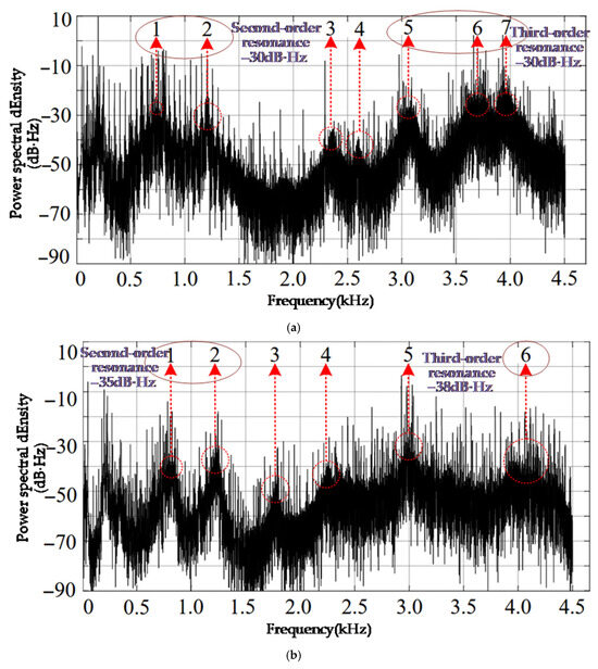 Figure 14 shows the 42-slot and 53-slot rotor vibration spectrogram, where the label represents the number of the fluctuation points. The peak values at the second-order mode shapes labeled 1 and 2 in the optimized 53-slot rotor vibration spectrum are −35 dB·Hz, which is a decrease of 5 dB·Hz compared to the original 42-slot rotor. The points labeled 3 and 4 are fluctuation points caused by motor vibration and are not resonance points, so they are not analyzed further; The peak value at the third-order mode at point 5 is −35 dB·Hz, a decrease of 5 dB·Hz compared to the original 42-slot rotor; the amplitude of the third-order resonance peak at point 6 is −38 dB·Hz, a decrease of 18 dB·Hz compared to the original 42-slot rotor.