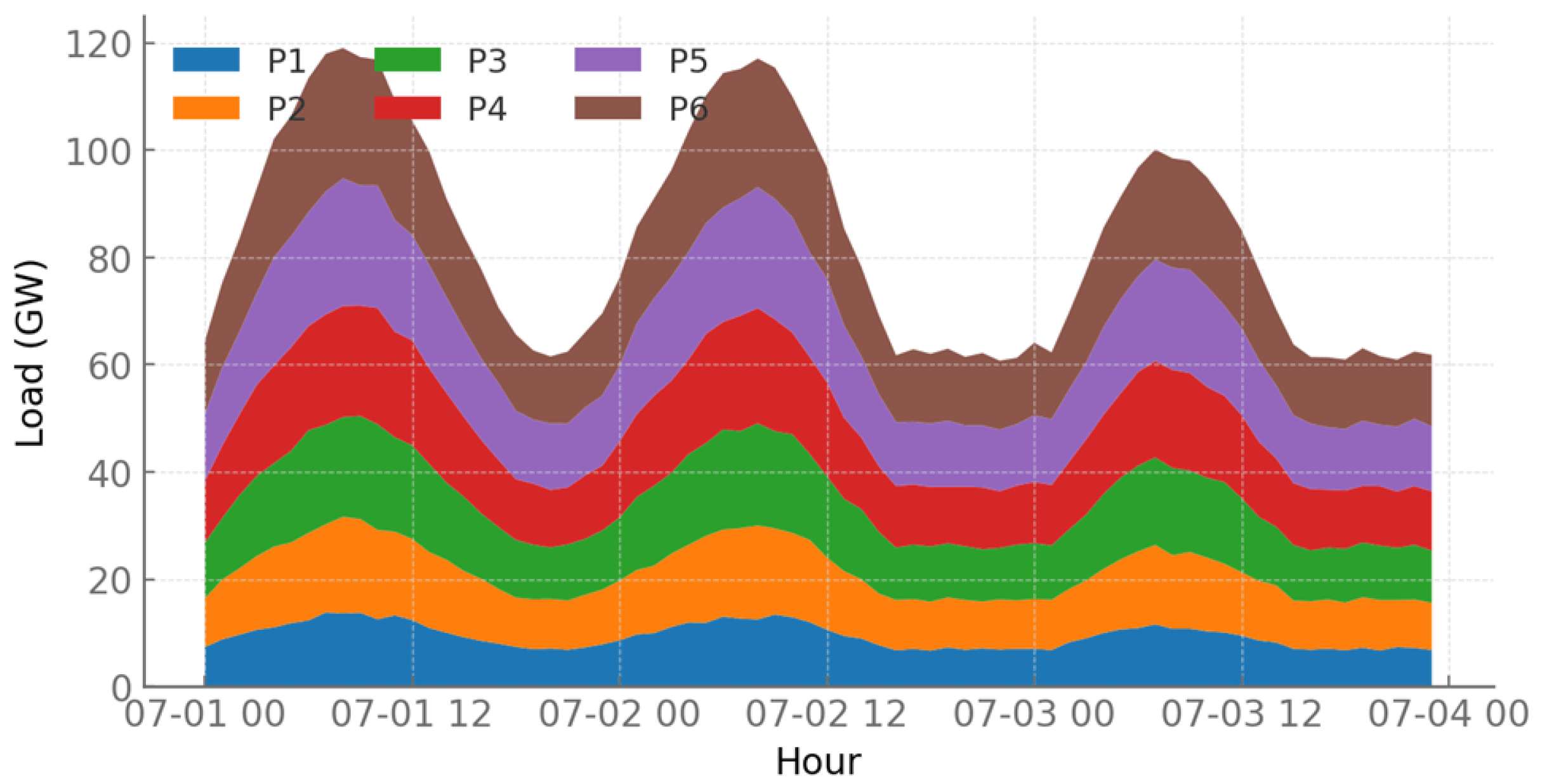 Figure 3, the stacked area representation provides a clear overview of the total system demand and the contribution of each province across the 72 h study window. The overall system load oscillates between roughly 75 GW at night and close to 125 GW during the late afternoon peaks, consistent with the combined peak values previously quantified for P1 through P6. The figure demonstrates that provinces P5 and P6 dominate the system demand, frequently accounting for 40 to 45 percent of total system consumption. Their combined contribution rises above 50 GW in the highest load hours, while the three smaller provinces P1, P2, and P3 together rarely exceed 30 GW. The visible layered fluctuations indicate synchronous diurnal patterns across provinces, with daily troughs around 03:00–05:00 and peaks around 17:00–19:00. This chart emphasizes how province-level peaks align temporally, reducing natural diversification and increasing the stress on inter-provincial balancing mechanisms. The concentration of peaks in the late hours of each day illustrates where emergency resource dispatch and corridor mobilization must be concentrated.