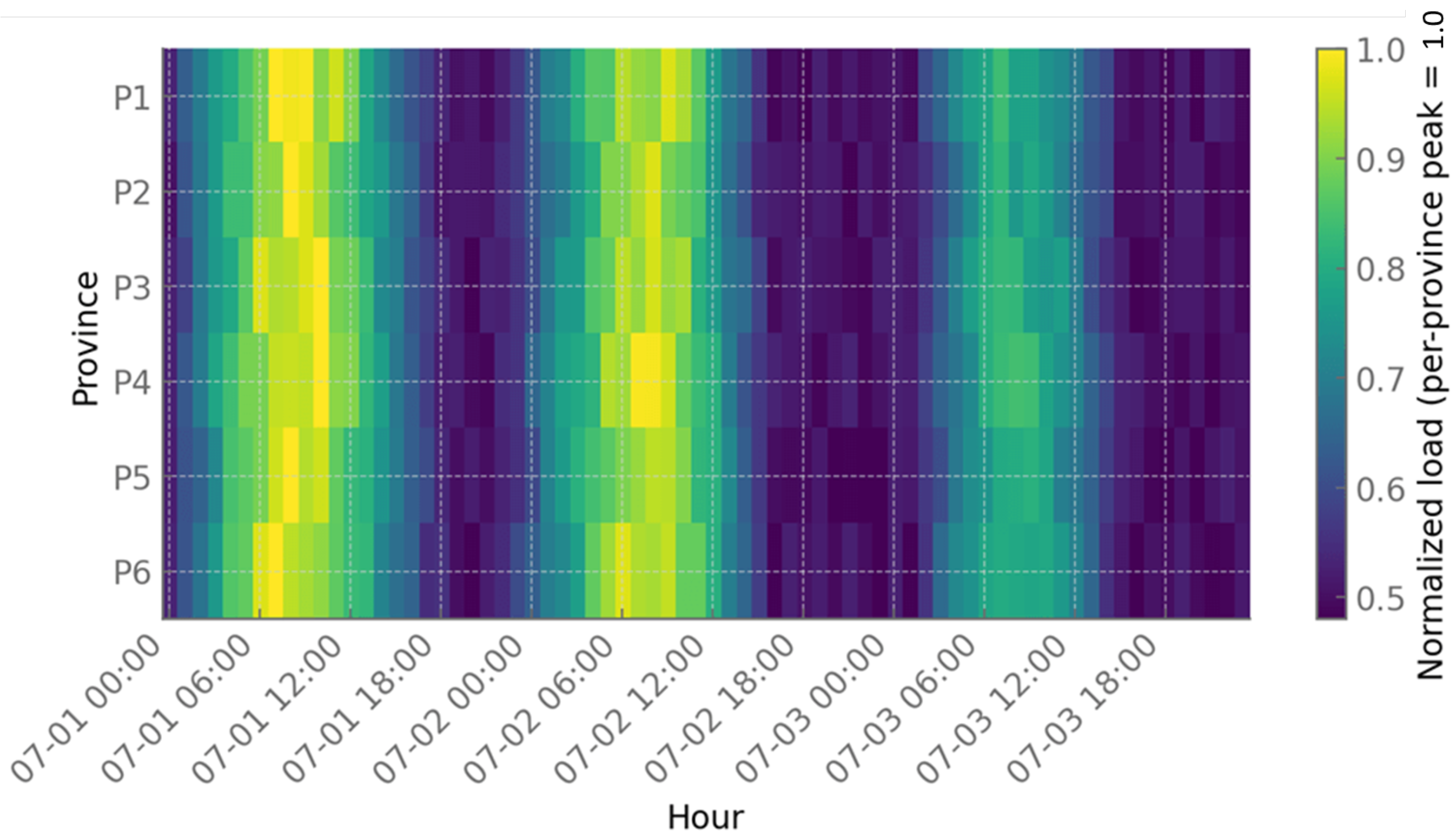 Figure 4 highlights the temporal patterns of demand in each province relative to its local maximum. Rows correspond to provinces, scaled so that the darkest blue cells correspond to 100 percent of each province’s 72 h peak. A repeated wave structure emerges, with three clear daily cycles of high activity spanning roughly 10 to 12 h each. Provinces P4 through P6 show broader high-load bands, often maintaining normalized demand above 0.8 for two-thirds of each day, indicating flatter load curves and higher baseload requirements. In contrast, P1 and P2 exhibit sharper transitions, spending up to 30 h of the 72 h window below 0.6 of peak demand, which suggests higher flexibility potential if demand-side response resources are activated. The uniformity of the vertical bands across rows confirms that peak hours are highly synchronized across provinces, meaning correlation coefficients among province loads exceed 0.9. This synchronization reduces the natural hedging benefit of interconnection and indicates that any stochastic scenario generation must incorporate correlated demand surges across multiple provinces.
