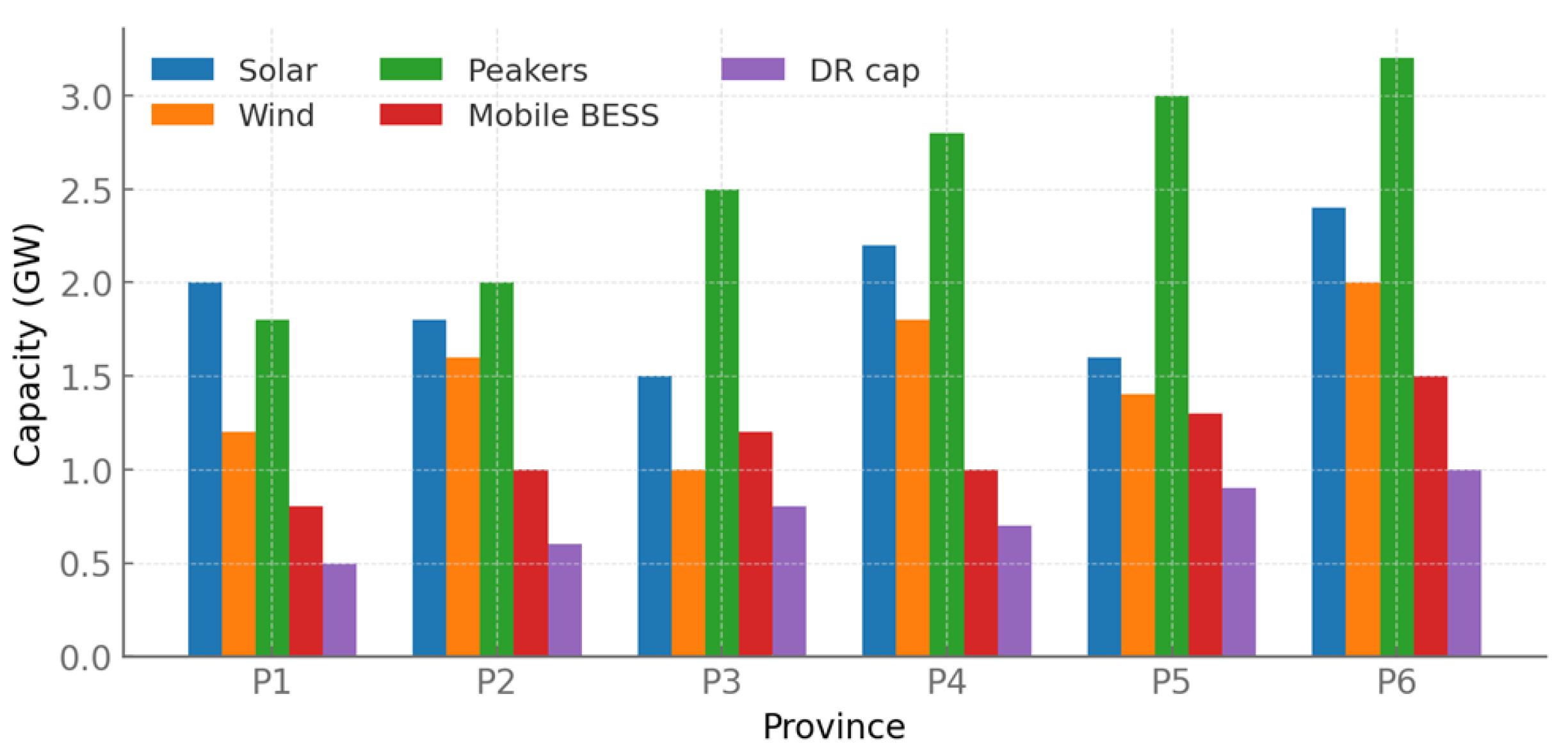 Figure 5 compares five categories of capacity across all six provinces: solar, wind, peakers, mobile BESS, and demand–response caps. Provinces P5 and P6 stand out with the largest overall emergency resource portfolio, each exceeding 8 GW when all categories are summed. P6 has 2.4 GW of solar, 2.0 GW of wind, 3.2 GW of peakers, 1.5 GW of BESS, and 1.0 GW of demand–response, totaling 10.1 GW of flexible and backup capacity. By contrast, P1’s portfolio sums to only 6.3 GW, with 2.0 GW solar, 1.2 GW wind, 1.8 GW peakers, 0.8 GW BESS, and 0.5 GW DR. The peaker category dominates across all provinces, consistently 25 to 35 percent of the emergency portfolio, while mobile BESS provides a modest but rapidly deployable 10 to 15 percent. The figure makes clear that the allocation of renewables does not mirror the allocation of emergency resources; for example, P4 has a relatively high 2.2 GW of solar but less DR capacity than P6. This mismatch highlights the importance of coalition-based sharing since provinces with weaker local portfolios will need to rely on inter-provincial transfers.