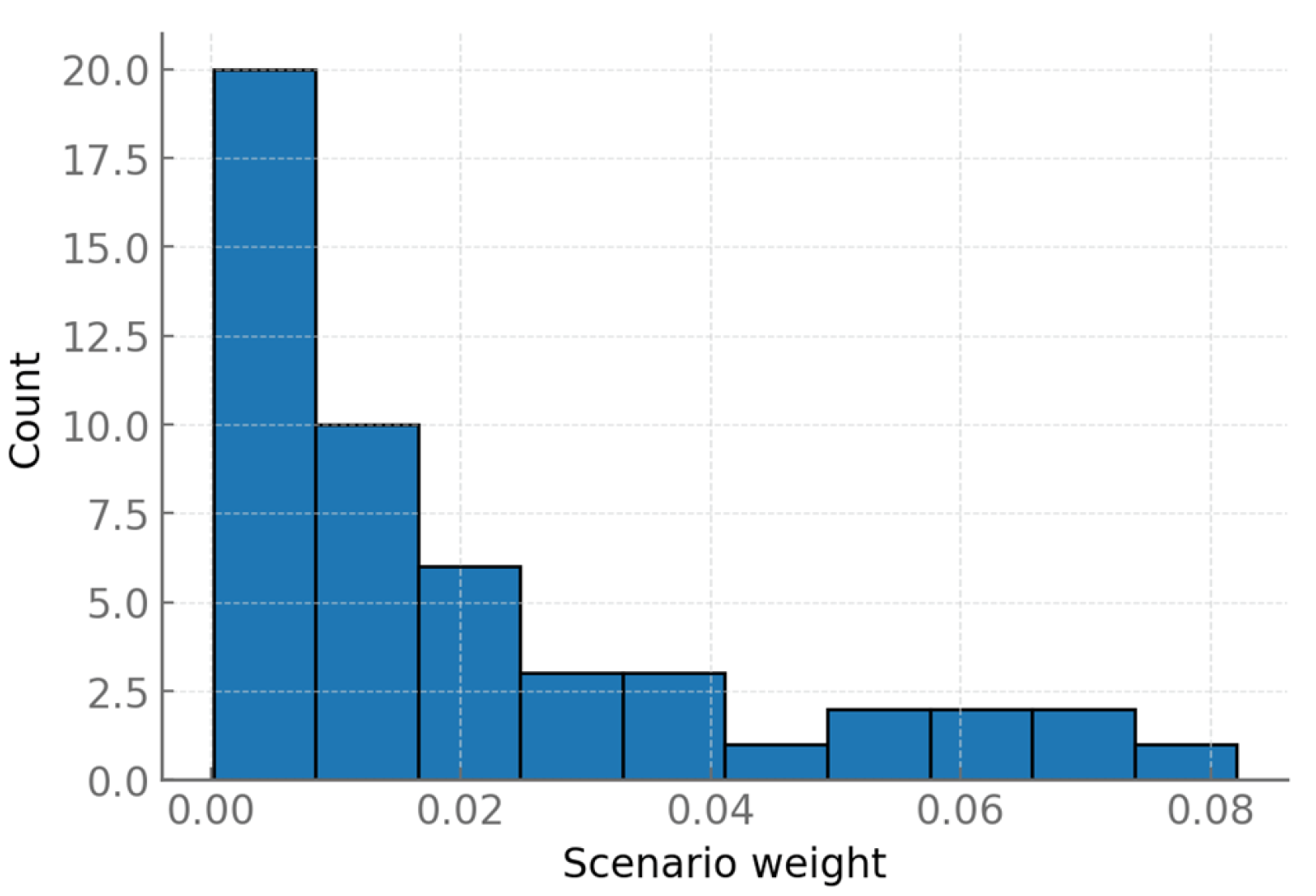 Figure 6 shows the histogram of probability weights associated with the 50 representative scenarios selected from the original 1000 stochastic realizations. The horizontal axis represents the assigned weight of each scenario, while the vertical axis indicates the number of scenarios within each weight interval. The distribution is highly skewed: a large fraction of scenarios are assigned very small probabilities, clustered below 0.02, whereas only a small number carry disproportionately large weights, with the maximum exceeding 0.07. This pattern demonstrates that while many scenarios exist, their relative influence on the optimization is uneven, and a limited subset of critical scenarios dominates the probabilistic space. The shape of the histogram arises naturally from the Bayesian updating process, where evidence progressively concentrates probability mass on scenarios that are more consistent with observed conditions, particularly those reflecting extreme but plausible combinations of high load demand and low renewable generation output. From a methodological perspective, the figure underscores how the Bayesian-DRO framework systematically balances breadth and focus. On the one hand, the inclusion of a large number of low-weight scenarios ensures that a wide diversity of possible operating conditions is acknowledged, maintaining representational completeness. On the other hand, the assignment of disproportionately high weights to a few extreme cases ensures that system operation and coalition mechanisms are stress-tested under the most consequential realizations. This dual structure is essential in environments characterized by uncertainty and strategic interaction, as it avoids overemphasis on average conditions while directly addressing the tail risks that most threaten reliability. The visualization further enhances the transparency of the modeling framework by making explicit the underlying probability structure driving the optimization. Readers can directly observe how the representative scenarios differ not only in content but also in their quantitative influence on the final outcomes. In practical terms, this highlights why coalition stability, welfare allocation, and incentive-compatible dispatch must be evaluated with respect to these high-weight scenarios, since they disproportionately determine performance under stress. By presenting this distribution, the figure links the technical process of Bayesian clustering and posterior updating with the practical goal of ensuring resilience and fairness in inter-provincial power system operation.
