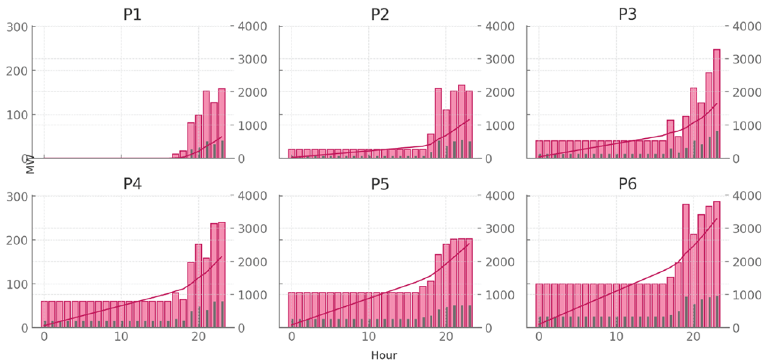 Figure 9 shows the hourly dynamics of demand response activation and rebound effects for six provinces over a 24 h period. Each subplot contains three layers of information: pink bars for DR activation, gray bars shifted by one hour for rebound load, and a line showing cumulative DR MWh utilized. The magnitudes differ by province, highlighting heterogeneous resource availability. In P1, activations rarely exceed 100 MW, peaking around 120 MW in the early evening, with rebounds of 30–35 MW. The cumulative line climbs gently to around 1500 MWh by the end of the day. In contrast, P5 shows much stronger activity: DR activation exceeds 250 MW during the evening peak, with rebounds surpassing 80 MW in the following hour. Its cumulative DR climbs to nearly 3500 MWh. P6 also shows aggressive usage, although with slightly lower peaks around 200–220 MW. Provinces P2, P3, and P4 fall between these extremes, with peaks of 150–180 MW and cumulative totals of 2000–2500 MWh. Across all provinces, rebounds remain about 25 percent of activation, consistent with behavioral models of deferred demand. What stands out is the steep rise of cumulative DR during hours 17–20, when system stress is highest, illustrating that resources are concentrated when needed most. The differences across provinces also highlight locational diversity: some areas have significant headroom in DR budgets, while others saturate quickly. In sum, the figure quantifies both the scale and timing of DR, ranging from modest 1500 MWh to heavy 3500 MWh activations, and clarifies how rebound load materializes in the hours following major activation events.