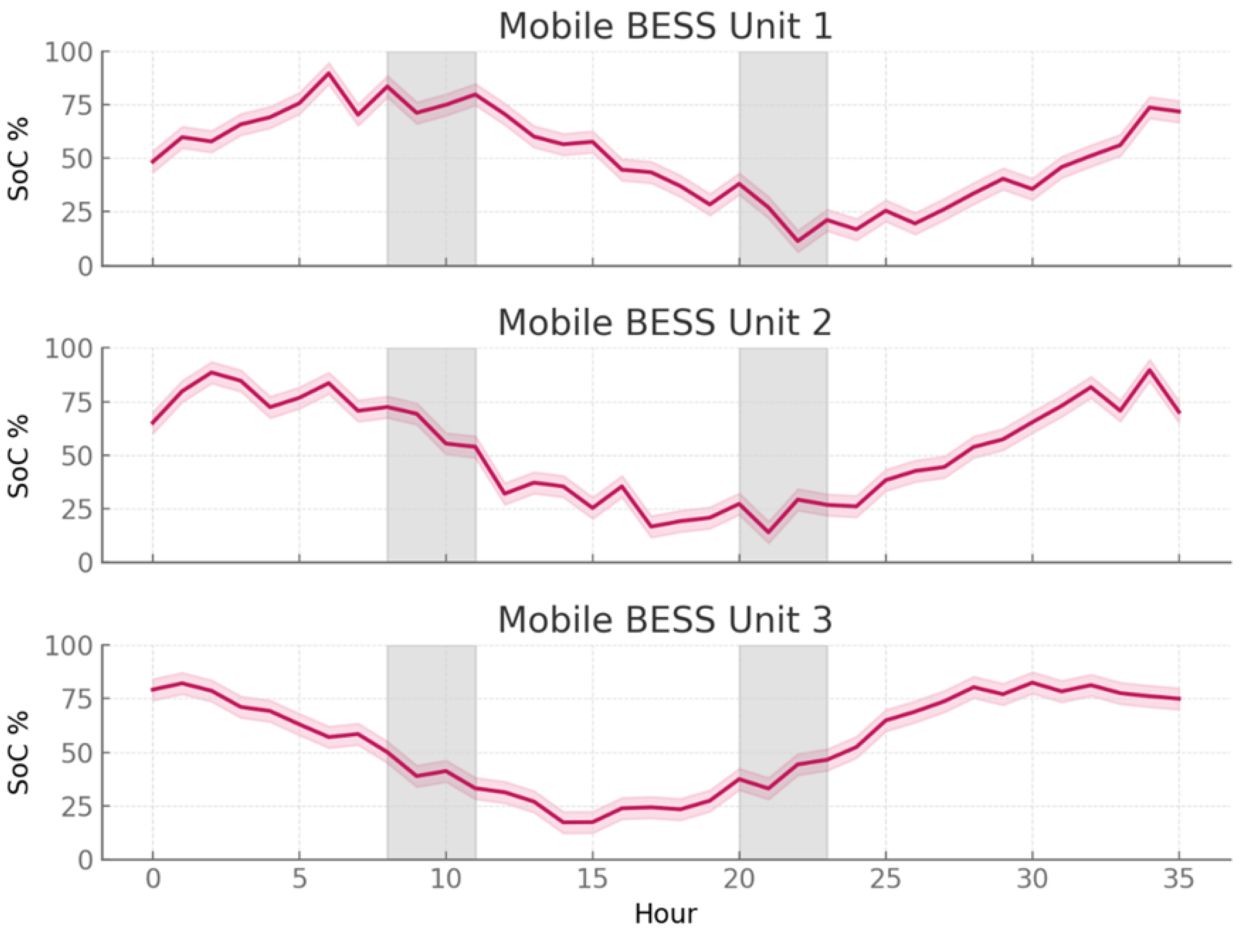Figure 10 depicts the operation of three mobile BESS units over a 36-hour horizon, showing their state of charge (SoC) along with shaded travel periods. The pink median lines reveal cyclical charge–discharge patterns, while the shaded ribbons mark the 25th–75th percentile spread across scenarios. For Unit 1, SoC cycles between about 20 and 90 percent, with mobilizations at hours 8–11 and 20–23 (highlighted by gray vertical bands) that correspond to travel delays. During travel periods, the SoC remains flat, and afterwards the unit resumes discharging to cover demand peaks. Unit 2 follows a similar pattern but with smaller amplitude, keeping SoC within 30–80 percent. The 25th–75th percentile band is narrower, about ±5 percentage points, indicating more predictable utilization. Unit 3 is more variable, with swings as large as 60 percentage points between charge and discharge states, and uncertainty spreads up to ±10 percentage points. This reflects deployment to provinces with higher renewable variability, making its utilization more scenario-sensitive. Taken together, the three units demonstrate the logistics of mobility: traveling twice per day, losing 2–3 h of operational availability each time, and then cycling through 1–2 charge–discharge episodes around demand peaks. The operational numbers show both the promise and cost of mobility—by moving, units can address spatial shortages, but their SoC bands reveal energy opportunity costs associated with downtime. The figure thus provides a granular picture of mobile storage, quantifying SoC dynamics in the 20–90 percent range and highlighting how logistics interact with system peaks.