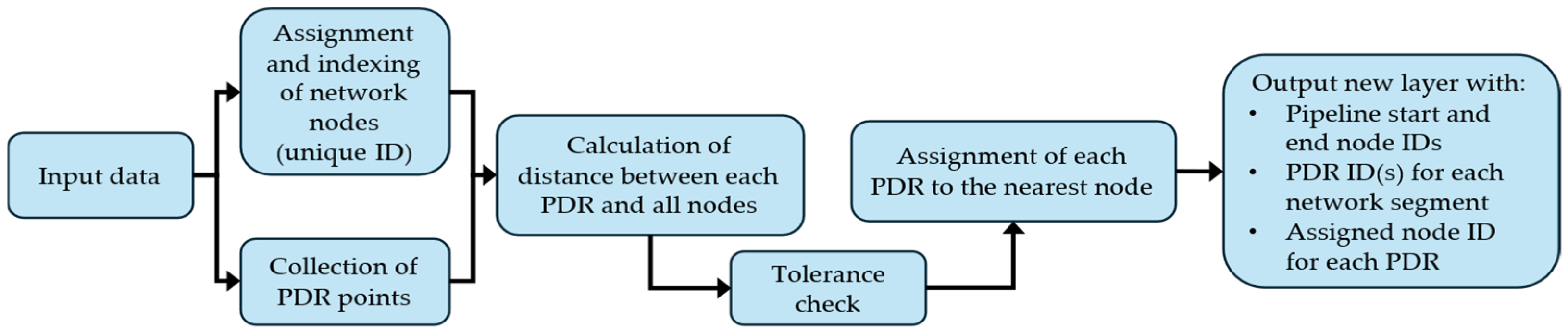 This methodological step addresses a major operational criticality: while the gas network is precisely digitized through technical mapping and GIS tools, the location of PDRs is often determined through geocoding processes and, as a result, does not exactly coincide with the digitized geometric nodes. To overcome this discrepancy and enable the logical and automated aggregation of PDRs to the network, an algorithm was developed in the Python/QGIS environment that can associate each user with the nearest node based on the minimum geographic distance.