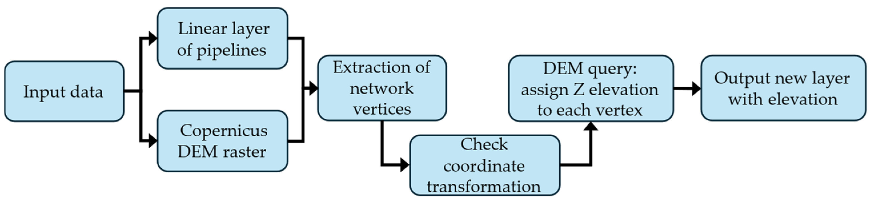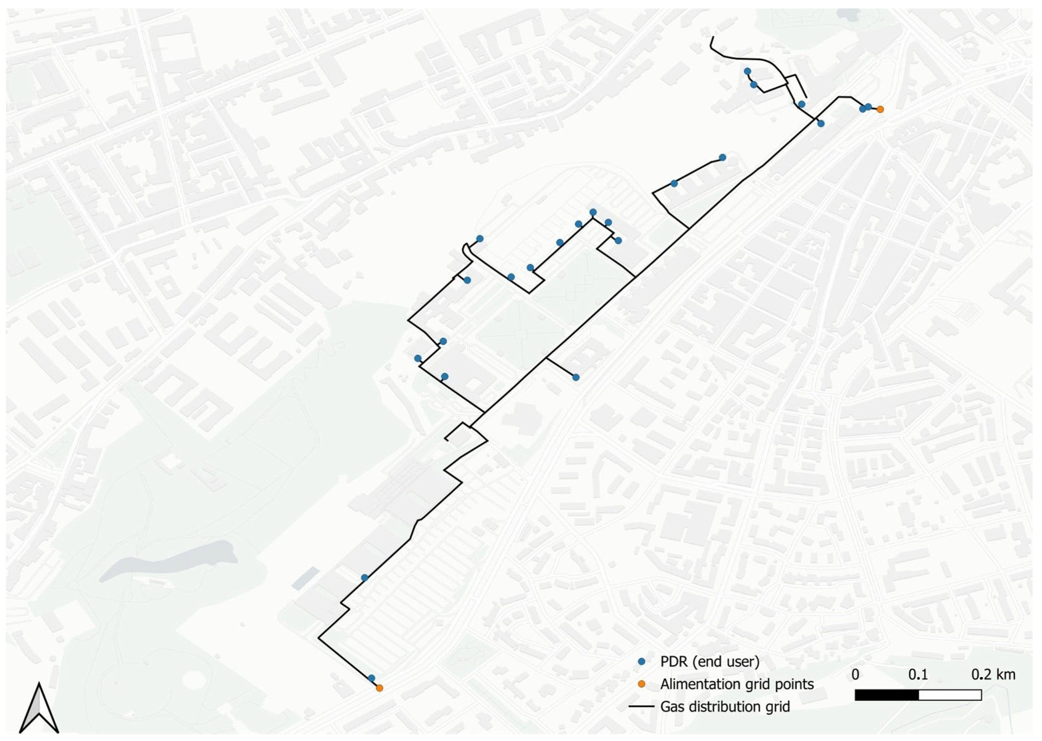 The representation of the gas distribution network was developed and processed within the open-source GIS environment QGIS, following the methodology in