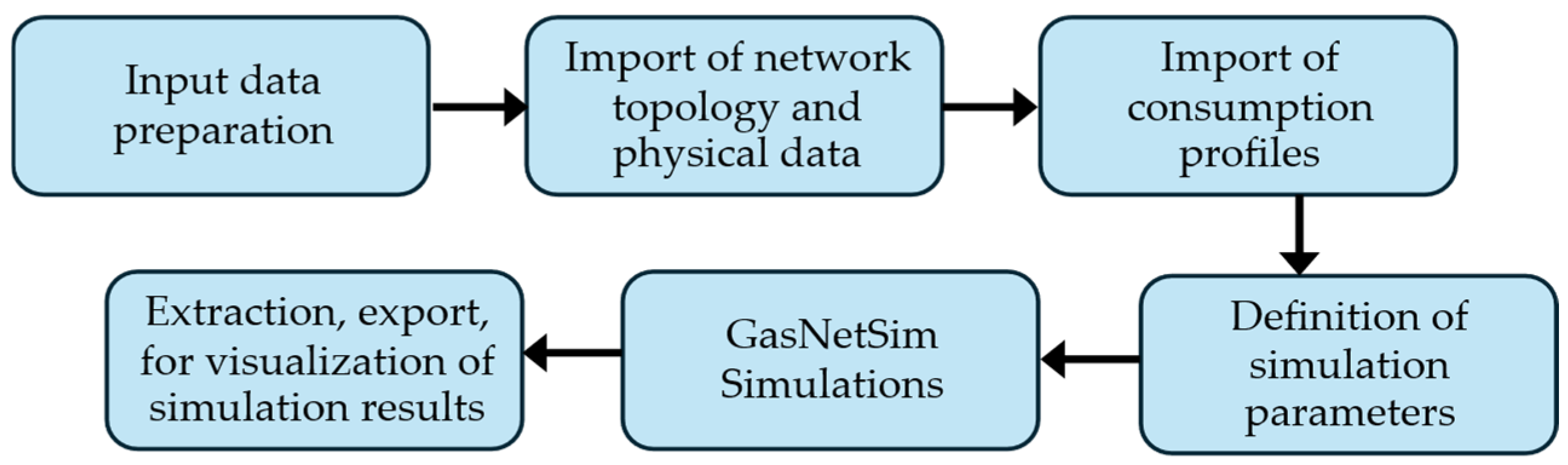 After defining and importing the input files related to the physical structure of the network (nodes and pipelines) and the aggregated hourly consumption profiles for each PDR, the methodology involves the timely definition of the simulation parameters and their transmission to the GasNetSim calculation environment. These parameters constitute the set of operating conditions and numerical assumptions that govern the performance of the network simulation, and they are configured directly through Python scripts, ensuring maximum flexibility and possibility of customization of operating conditions and properties of network components.