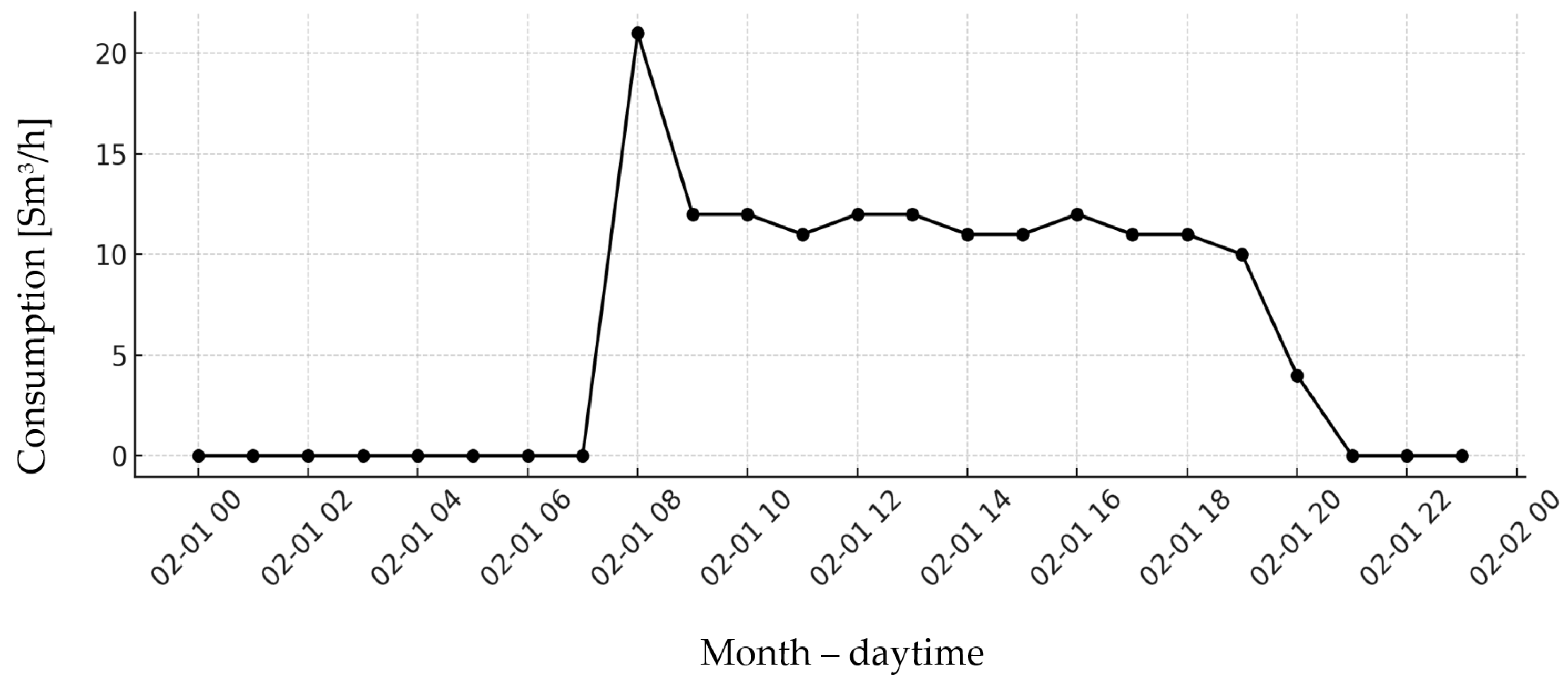 Section 2.2.3. The hourly consumption profile clearly represents a usage pattern typical of educational and research facilities, characterized by a concentration of gas demand during operational hours and minimal to zero consumption during off-hours. Generally, consumption peaks in the early morning when the heating system is activated, stabilizes throughout the working day with minor fluctuations, and significantly decreases after typical working hours.