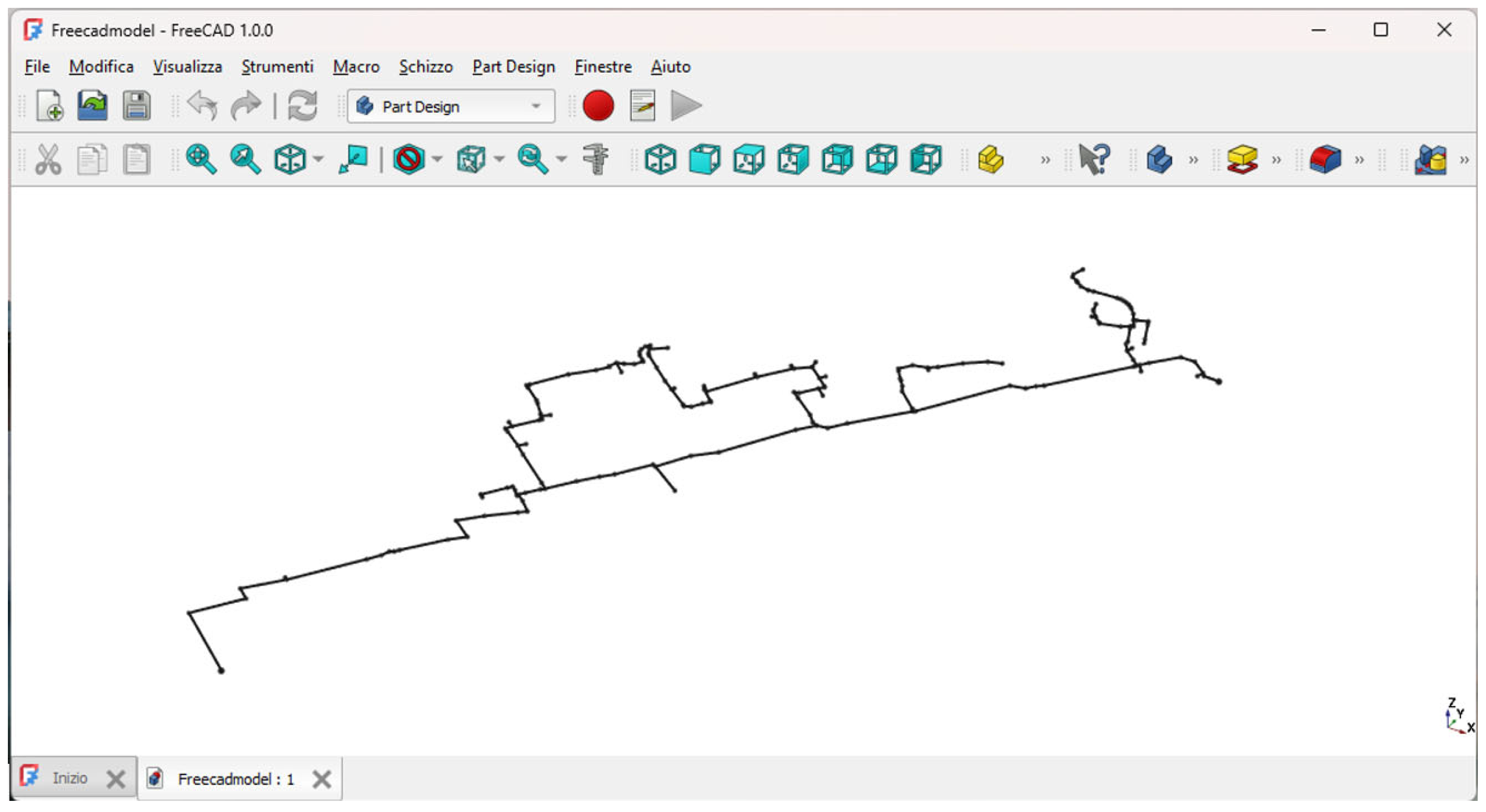 The next step is to export the network in metric format, ready for subsequent import into the CAD environment. Once all these procedures have been completed, the file is imported into FreeCAD, where a dedicated macro has been developed for reading and associating the elevations of the nodes, as well as all the attributes necessary for numerical simulation. The resulting model, displayed within the FreeCAD CAD environment, thus takes on a complete 3D representation of the network, as shown in