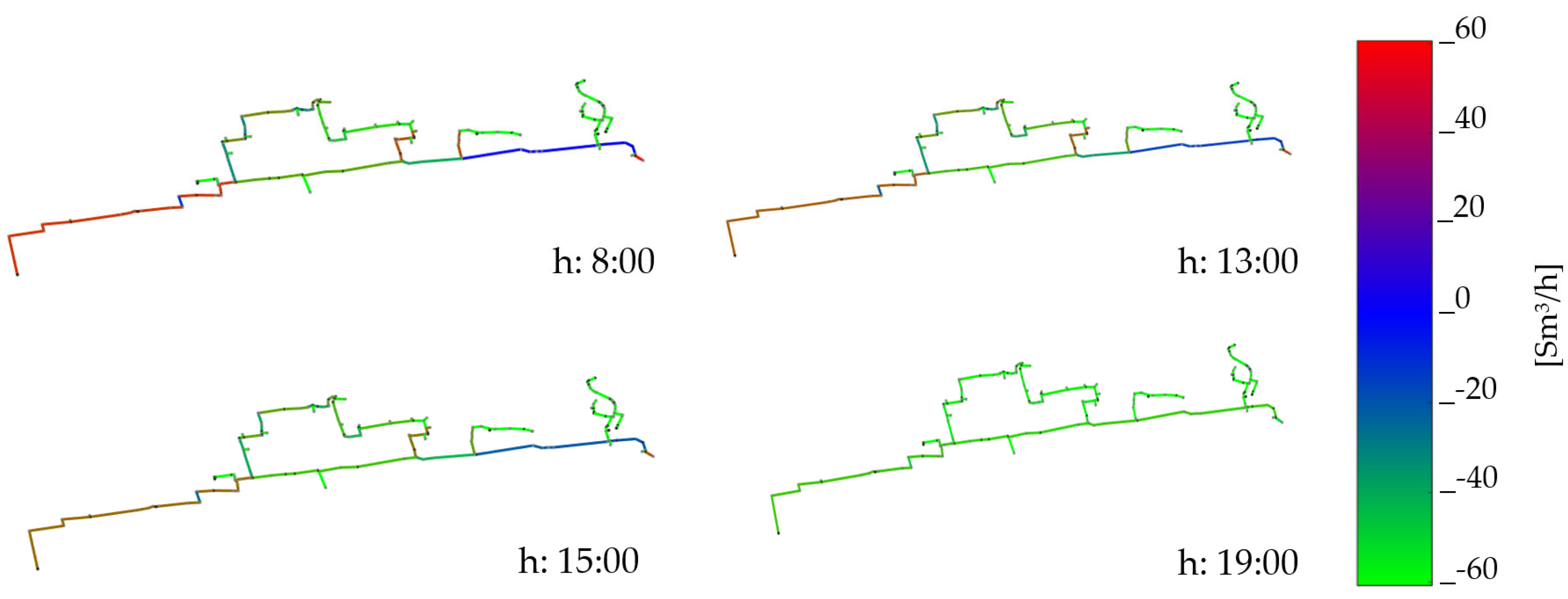Figure 11 shows the results of the numerical simulation of the flow rate within the gas network, obtained by exporting from the FreeCAD environment for four moments representative of a typical winter operating day: 8:00 a.m., 1:00 p.m., 3:00 p.m., and 7:00 p.m. For each selected time, the colorimetric map allows visualization of the distribution of flow values along all pipelines in the network. The side graphic scale indicates the range of simulated values expressed in Sm