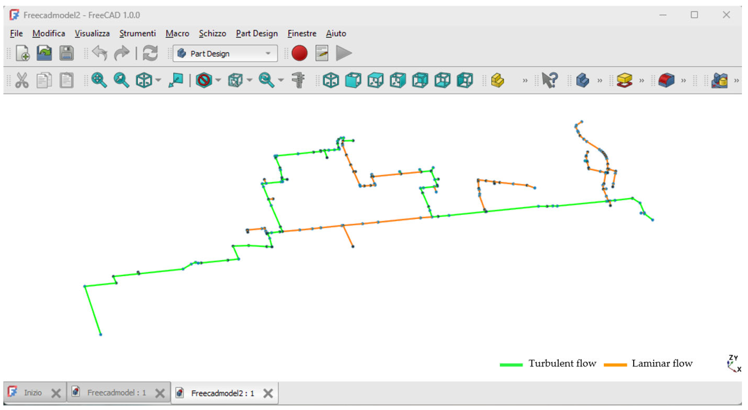Figure 12 shows the represents an export from the FreeCAD environment related to the flow regime in the gas network pipelines, obtained as the output of the hourly simulation. Colorimetric mapping allows immediate distinction between different operating conditions: sections in green indicate pipelines in a turbulent flow regime, where the gas flow rate and velocity result in highly mixed, nonlaminar behaviour; sections in orange identify sections in laminar regime, where the gas motion is orderly and the velocity lower.