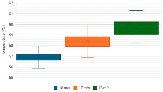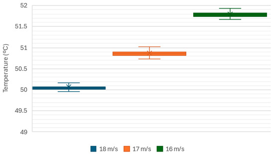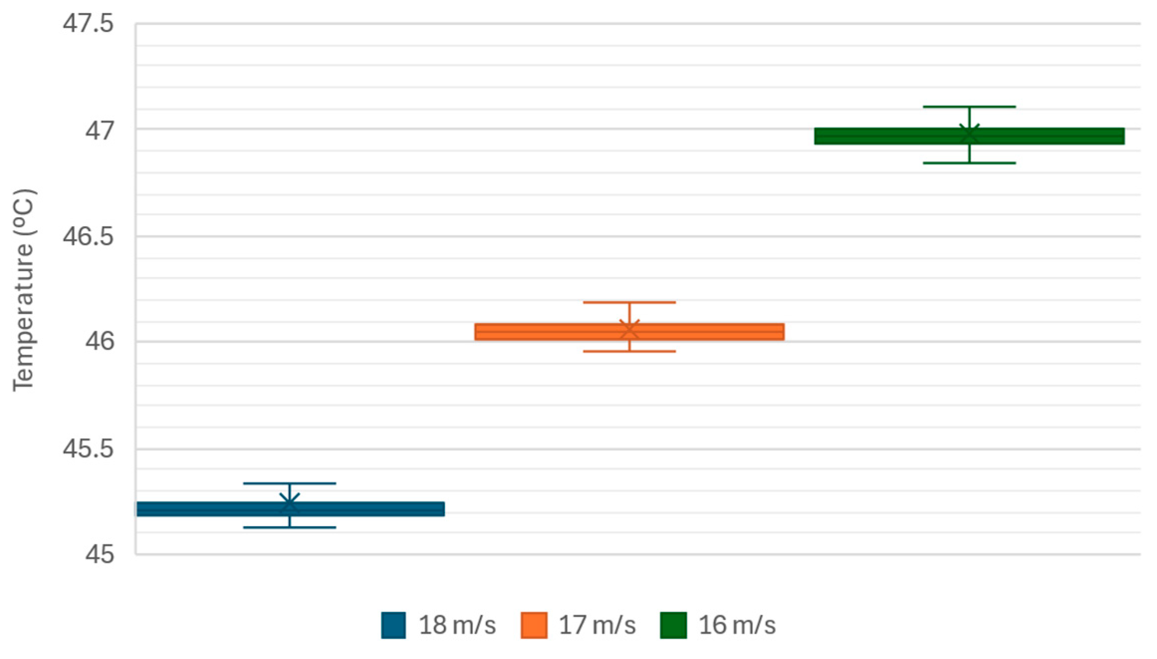 Figure 9 displays the maximum temperature of the cells for the same condition. At 18 m/s, the maximum temperature reached 56.91 ± 0.51 °C. For 17 m/s and 16 m/s, the maximum temperatures were 58.43 ± 0.53 °C and 59.67 ± 0.65 °C, respectively. All monitored cells therefore remained below the 60 °C regulatory threshold, though the margin decreased noticeably as airflow velocity was reduced.