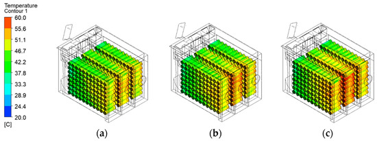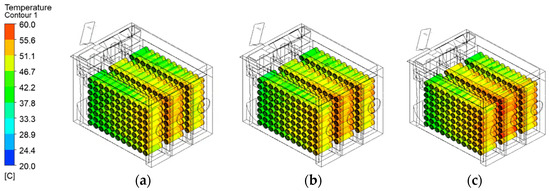 Figure 13 provides a contour visualization of the temperature distribution across the battery cells at 30 °C. This figure illustrates the spatial distribution of cooling effectiveness and highlights areas of localized heating with temperature up to 65 °C. At 18 m/s (a), the temperature is more uniformly distributed, while at 16 m/s (c), noticeable hot spots appear in regions with reduced airflow. These contours illustrate the development of localized hot spots as airflow decreases, reinforcing that the current cooling strategy loses robustness at elevated ambient temperatures.