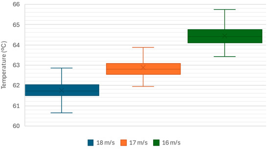 Figure 12 displays the maximum temperature for these conditions. At 18 m/s, the maximum temperature reached 61.73 ± 0.51 °C. For 17 m/s and 16 m/s, the maximum temperatures were 62.88 ± 0.57 °C and 64.48 ± 0.47 °C, respectively. These results indicate that, under elevated ambient conditions, parts of the pack exceeded the 60 °C threshold. While the system therefore complies with the competition’s requirements, the occurrence of localized hot spots highlights that its thermal margin is reduced at higher temperatures, reinforcing the need for further design refinements to improve robustness.